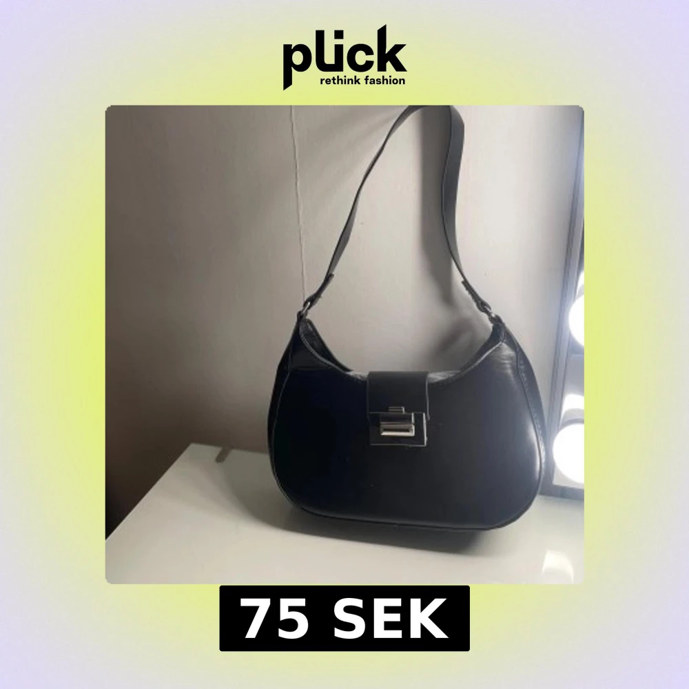 Snygg svart axelväska i skinn med ett stilrent metallspänne framtill. Väskan har en enkel och elegant design, perfekt för att komplettera din outfit. Ej använd