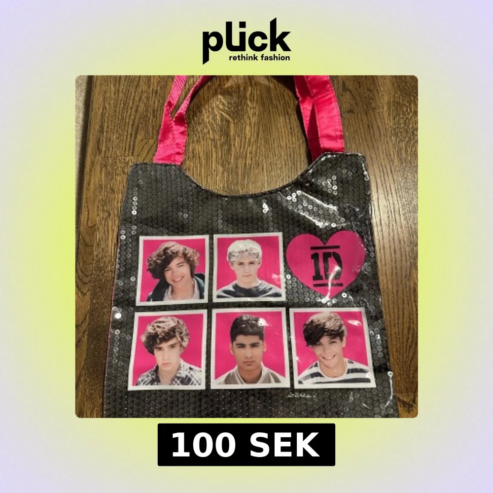 Cool shoppingväska med svart framsida täckt av glittriga paljetter, rosa baksida och handtag i satin. Framsidan har bilder på One Direction-medlemmarna och ett stort rosa hjärta med bandets logga. Perfekt för dig som vill visa din fandom.