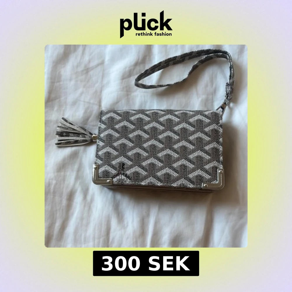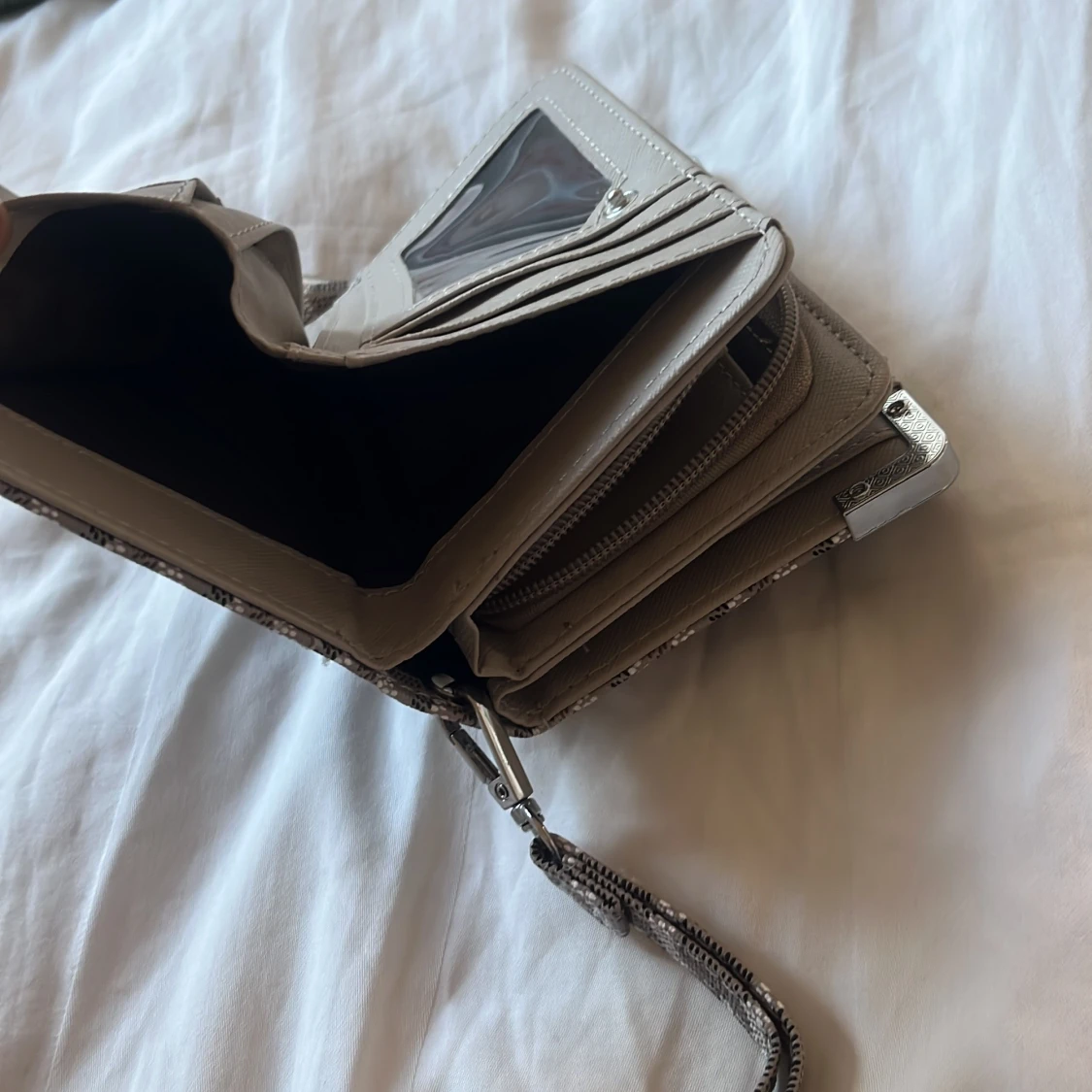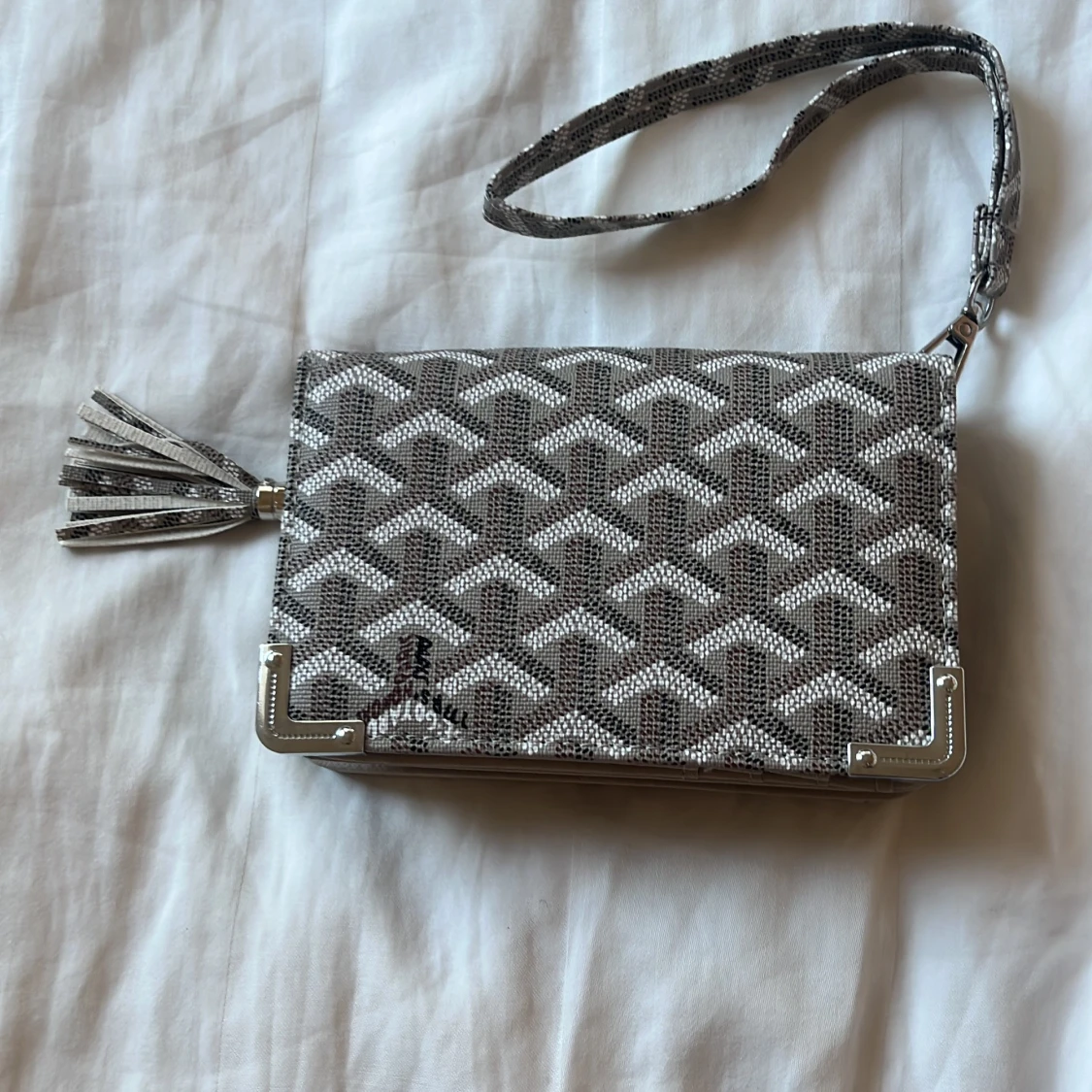 Snygg plånbok i grått och vitt med geometriskt mönster, silverfärgade metalldetaljer och en dekorativ tofs. Plånboken har flera fack för kort, myntficka med dragkedja och transparenta fönster för ID. Praktisk handledsrem för enkel användning.