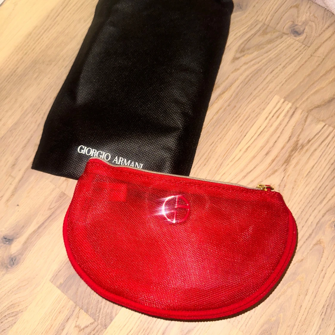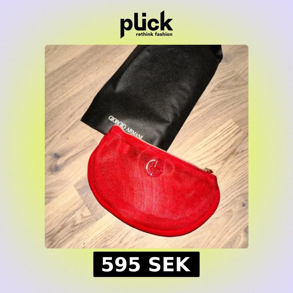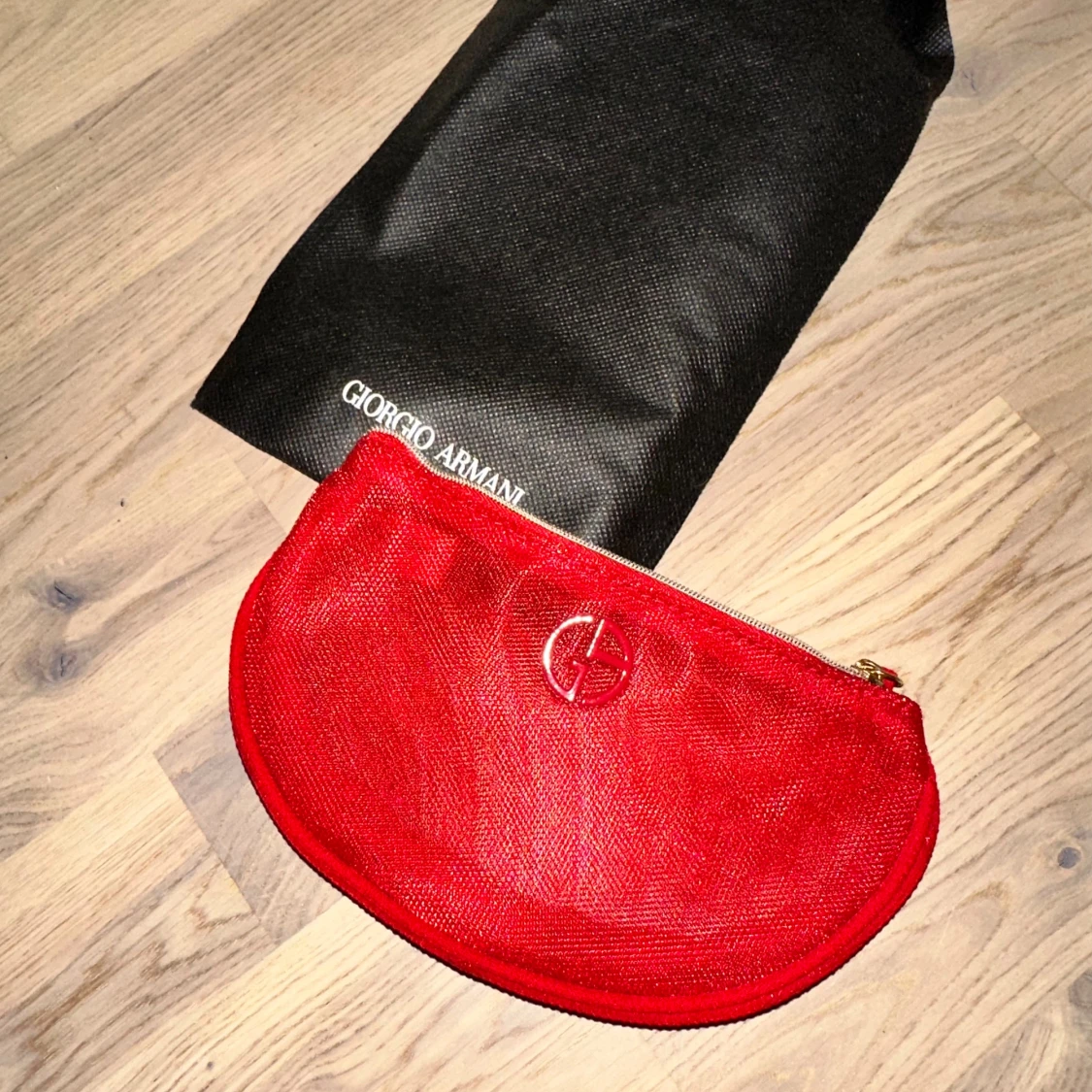 Snygg röd kuvertväska från Giorgio Armani med halvmåneform och guldfärgad dragkedja. Väskan har diskret logga framtill och är tillverkad i glansigt syntetmaterial. Perfekt för att bära det viktigaste och ger en lyxig touch till din outfit.