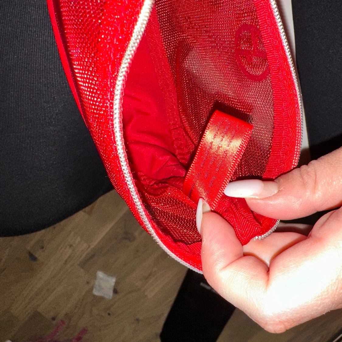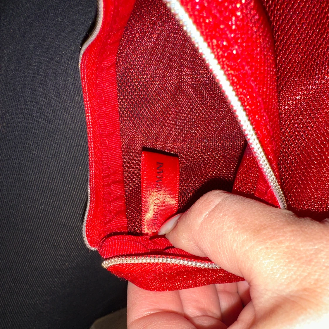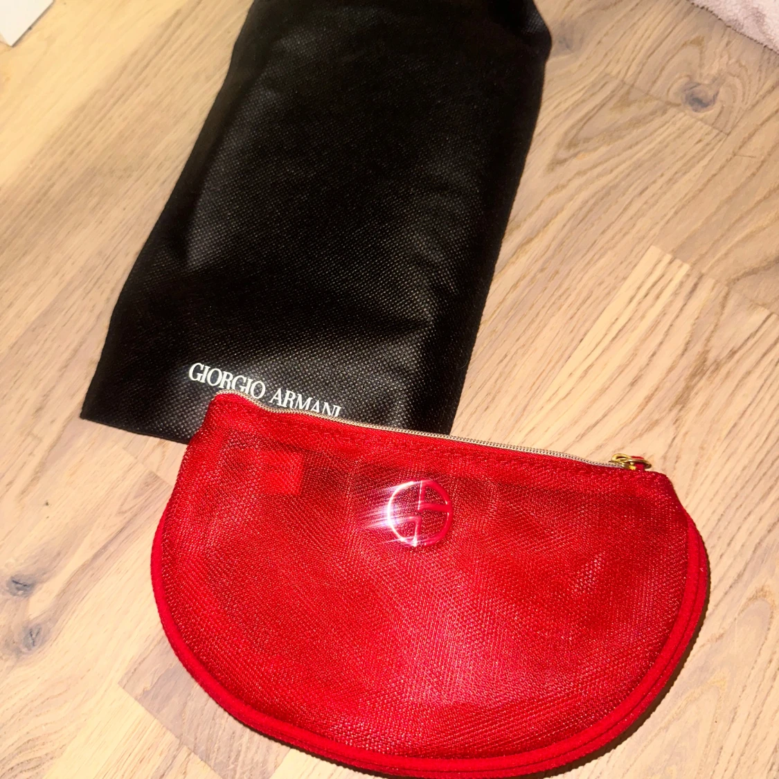 Snygg röd kuvertväska från Giorgio Armani med halvmåneform och guldfärgad dragkedja. Väskan har diskret logga framtill och är tillverkad i glansigt syntetmaterial. Perfekt för att bära det viktigaste och ger en lyxig touch till din outfit.