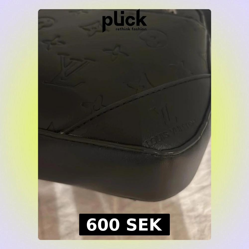 Säljer en svart axelväska i skinn med präglat monogrammönster. Väskan har bred justerbar axelrem, dragkedja med metall-detaljer och stilren design. Perfekt för dig som vill ha en lyxig och praktisk väska med ikonisk look.