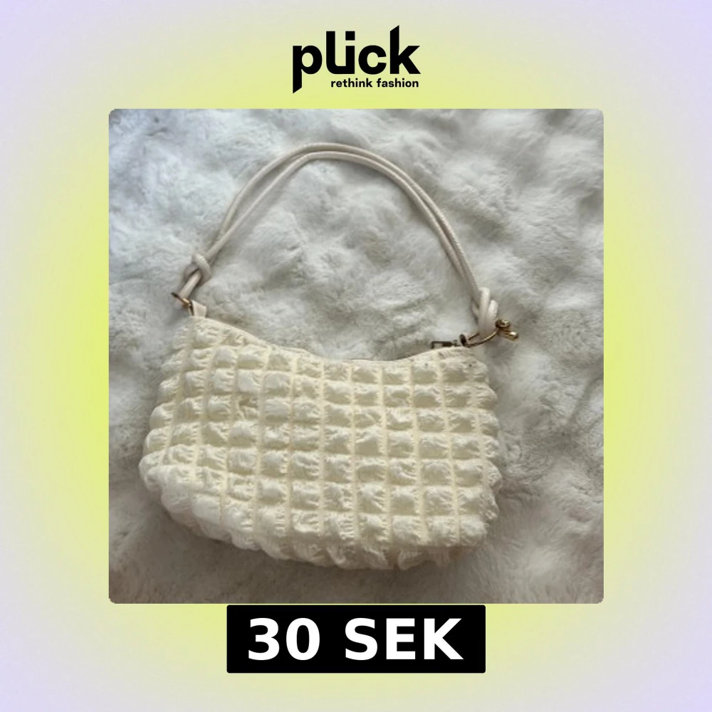 Superfin axelväska i fluffigt, quiltat tyg med rutmönster. Väskan är vit och har ett mjukt, strukturerat material som känns lyxigt. Handtaget är i ljus syntet med snygga knutdetaljer och guldfärgade metalldelar. Stängs med dragkedja och har ett rymligt innerfack.