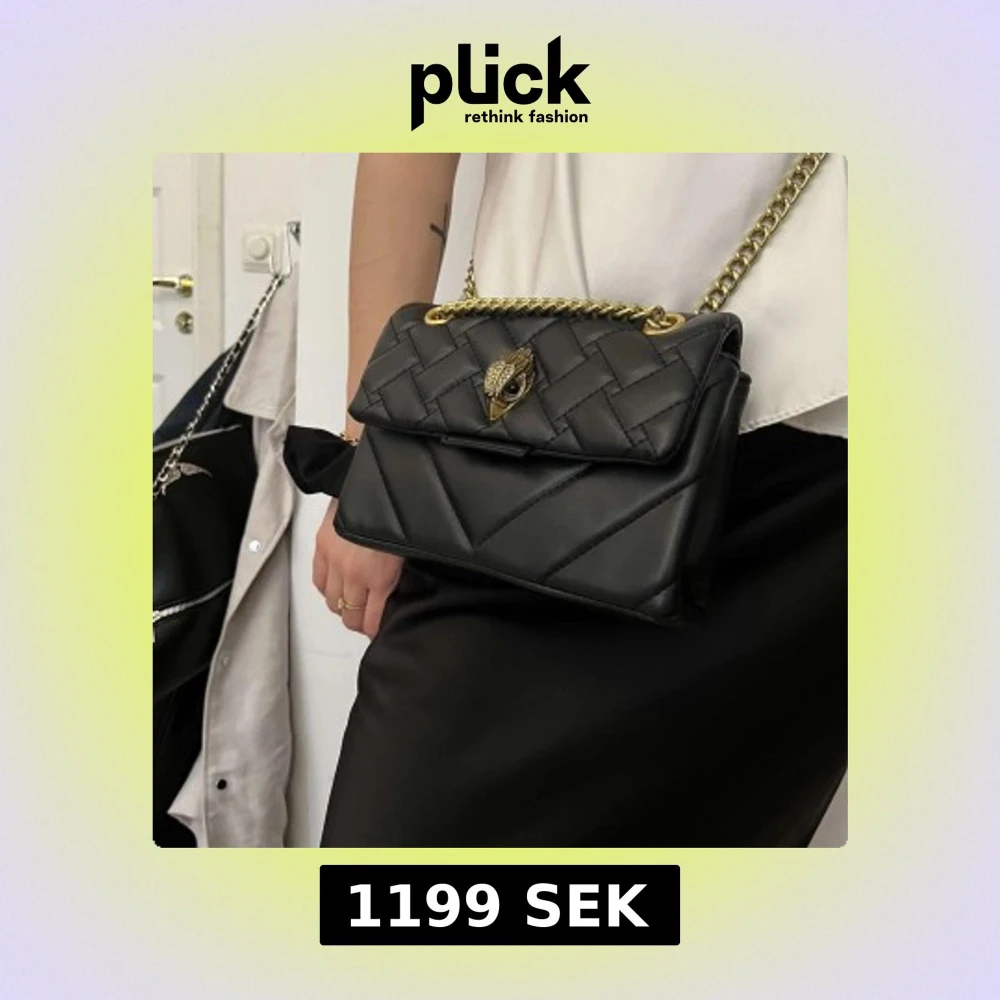 Snygg svart axelväska från Kurt Geiger med quiltat mönster och guldfärgad kedja. Väskan har ett dekorativt spänne framtill med en ikonisk örndetalj. Perfekt för att lyfta vilken outfit som helst.