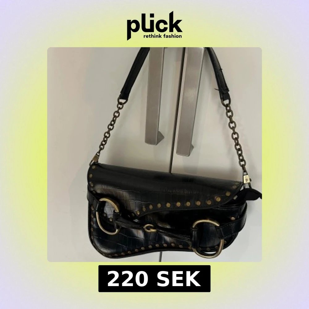 Snygg svart axelväska i skinnimitation med krokodilpräglat mönster. Väskan har guld detaljer och nitar. Inga tecken på användning