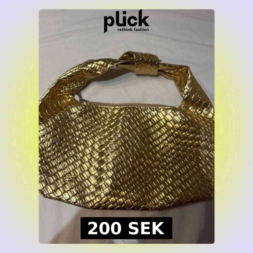Säljer en snygg axelväska i guld med krokodilinspirerat mönster. Väskan har en bred axelrem med knutdetalj och stängs med dragkedja. Perfekt för dig som vill sticka ut med en unik accessoar. Materialet är glansigt och ger en lyxig känsla.