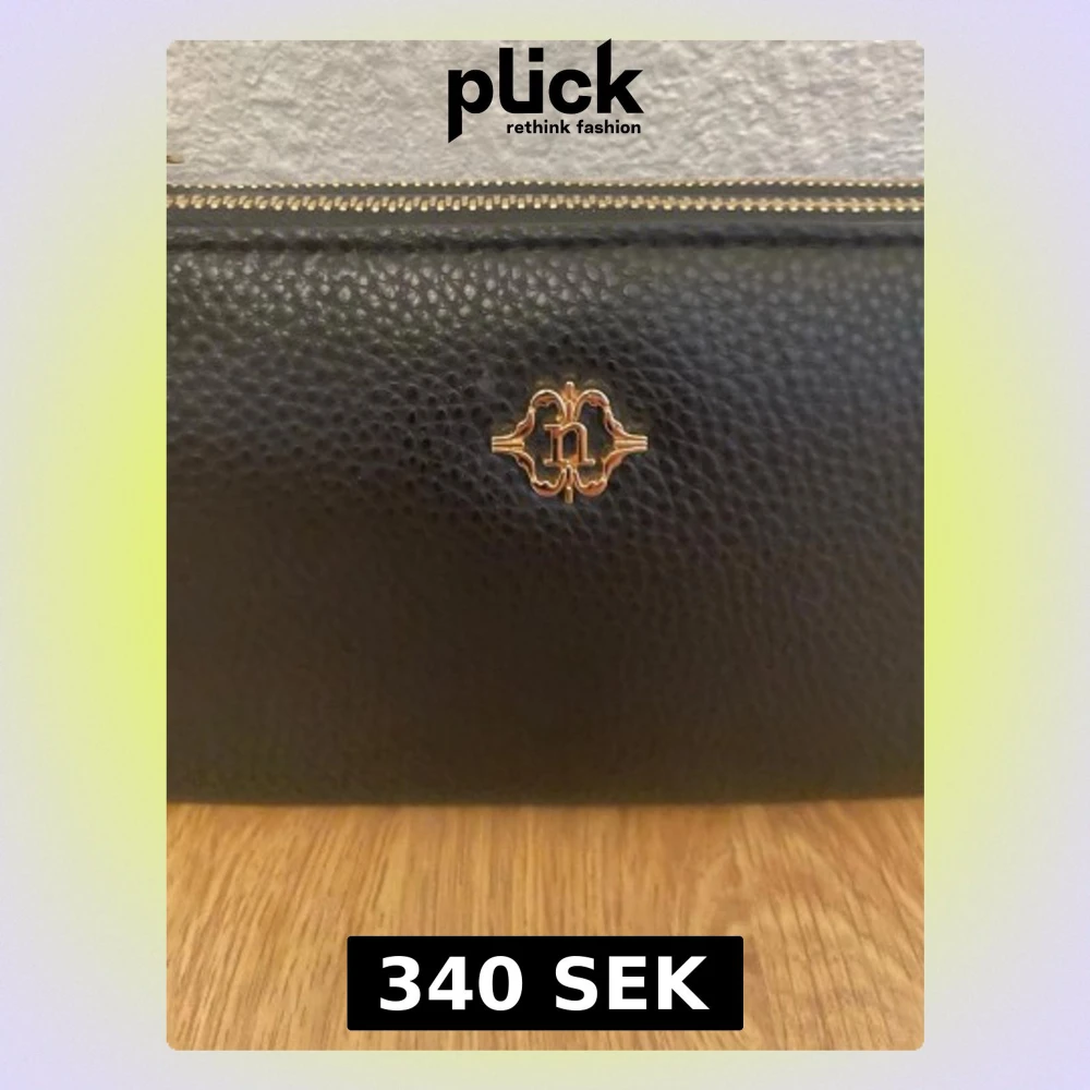 Snygg svart plånbok i skinn med guldfärgad logga och dubbla dragkedjor. Plånboken har en praktisk handledsrem och stilren design med struktur i materialet. Perfekt för att hålla koll på kort och kontanter när du är på språng.