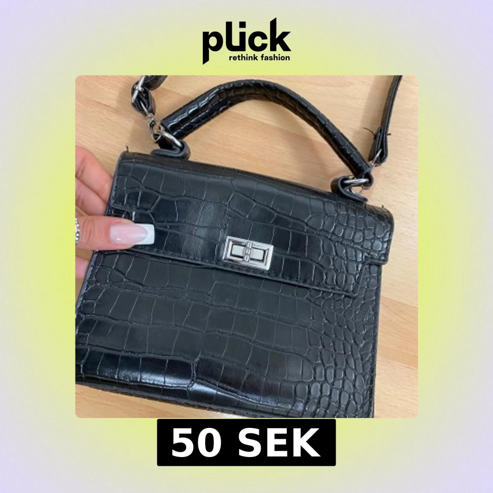 Snygg svart handväska i syntet med krokodilmönster och silverfärgad låsdetalj. Väskan har både handtag och en avtagbar axelrem för flexibilitet. Perfekt för att ge en stilren touch till din outfit.