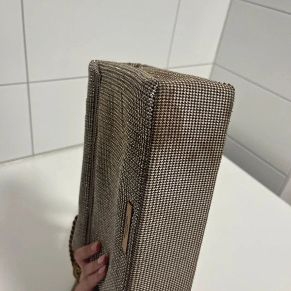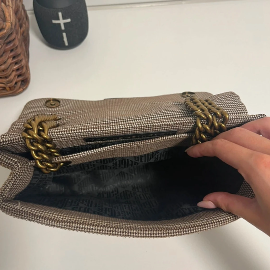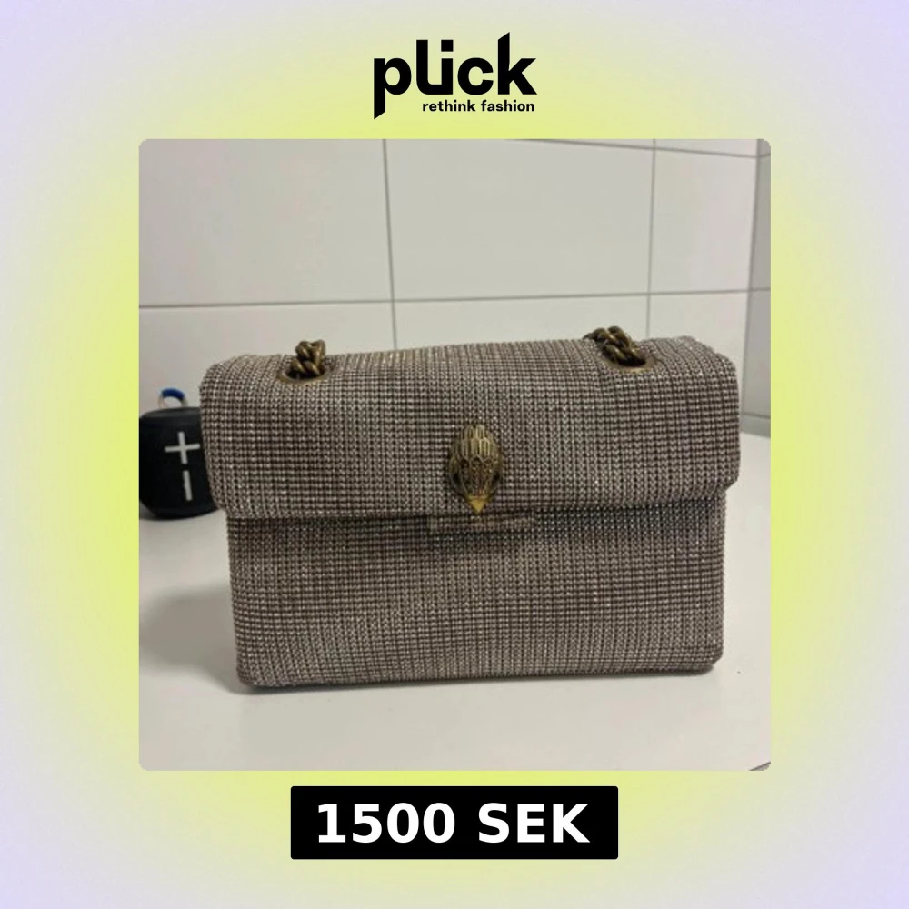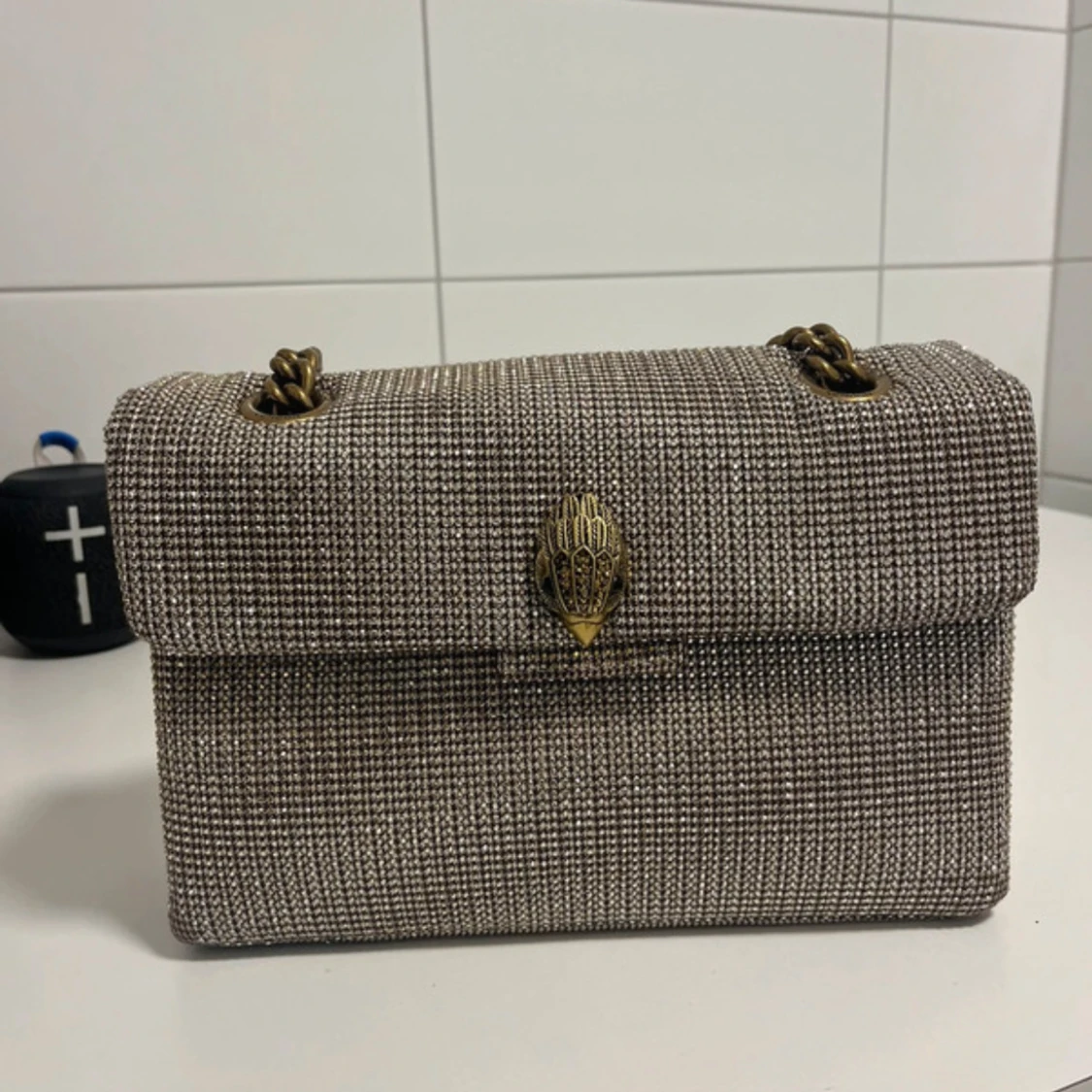 Säljer en snygg rutig Kensington axelväska från Kurt Geiger London. Väskan har guldfärgad kedja, ikonisk örndetalj på locket och är tillverkad i tyg med rutigt mönster i beige och brunt med stenar. I ganska bra skick förutom under sidan som har en tydlig prick och därav priset. Storleken är i deras större modell