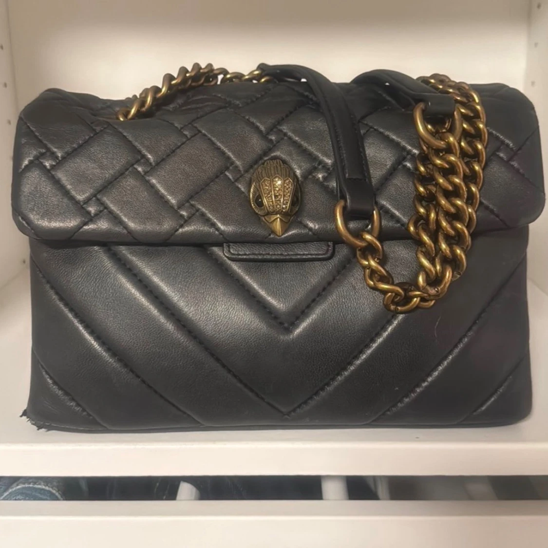 Svart väska med guldfärgad kedja och detaljer. Väskan har ett quiltat mönster. Små defekter i hörnen men inget man tänker på, borde även kunnas lagas eller fyllas i, inga defekter innuti fint skick, kan skicka mer bilder