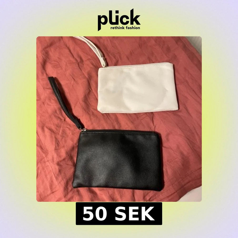 Två stilrena kuvertväskor i svart och vitt med enkel design. Båda har handledsrem och dragkedja upptill. Perfekta för att bära mobil, kort och småprylar. Materialet är slätt och känns som syntet. Snygga accessoarer som lyfter din outfit.