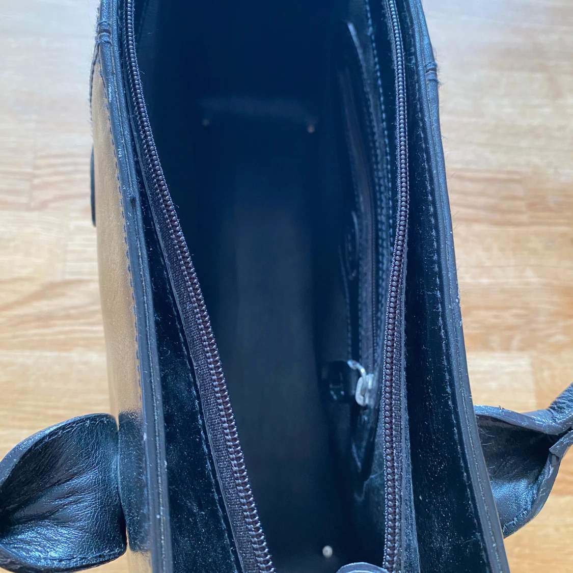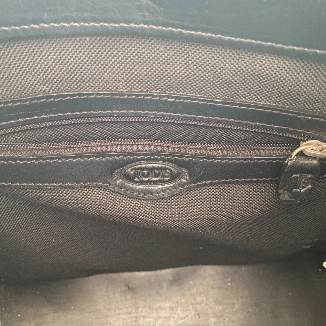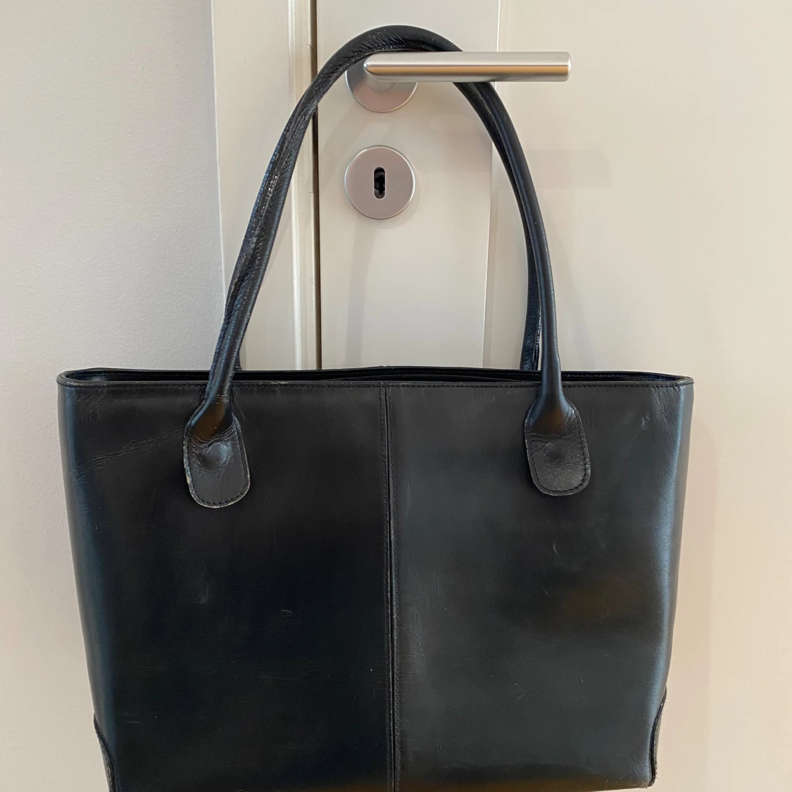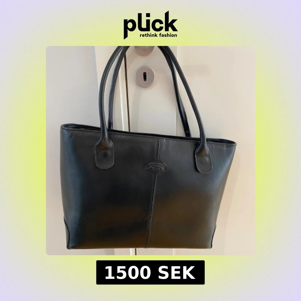 Stilren svart handväska från Tod's i äkta skinn med klassisk rektangulär form. Väskan har två långa handtag, diskret logga framtill och dragkedja upptill. Invändigt finns ett fack med dragkedja för småsaker. Perfekt för dig som gillar tidlös design. Väskan är använd men i fint begagnat skick, de finns lite slitage där den svarta färgen försvunnit. Mått Höjd: ca 29 cm Bredd: ca 39 cm Djup: ca 14 cm Kommer från ett djur och rökfritt hem