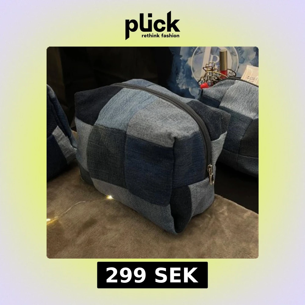 Snygg, rymlig, handgjord necessär i patchwork-stil gjord av olika nyanser av blått jeansmaterial som vi återvunnit. Den har en praktisk dragkedja upptill och är perfekt för att förvara smink eller andra artiklar. En unik accessoar för den som gillar denim!