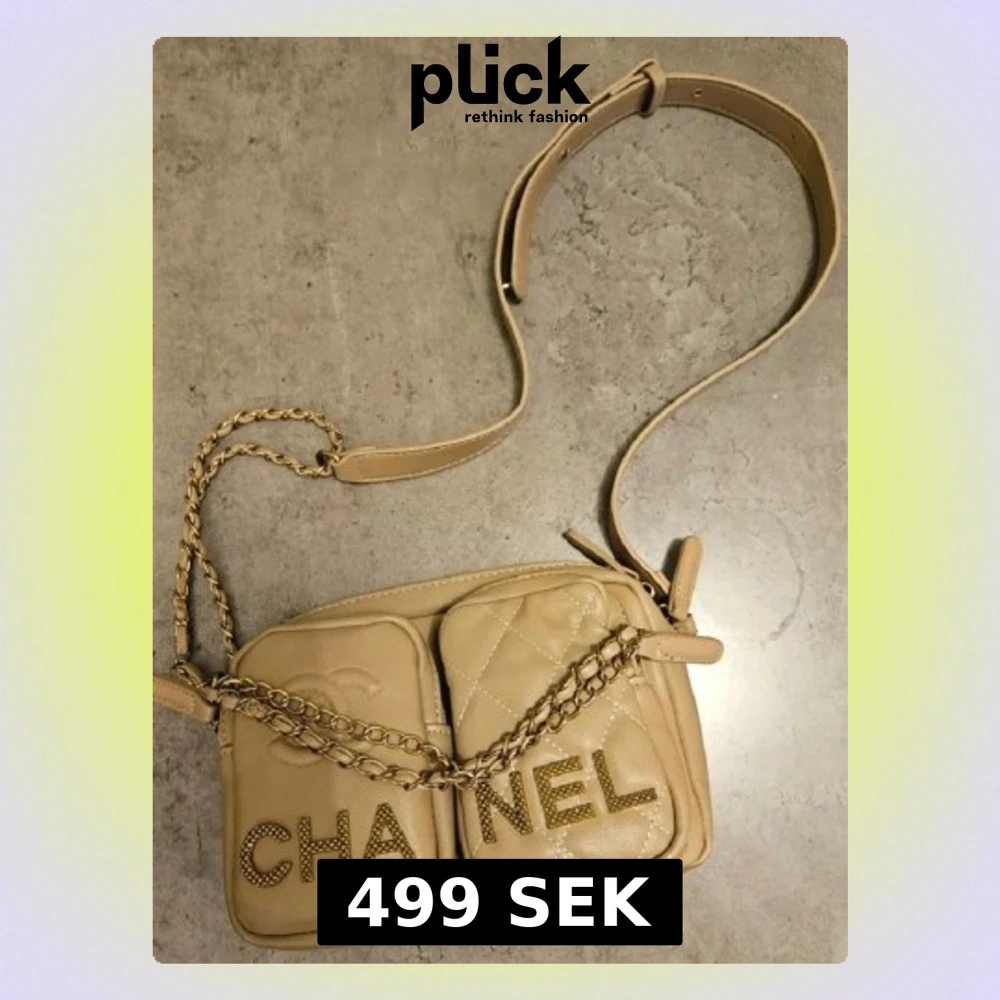 Säljer en beige axelväska från C h A n E l med två framfickor och kedjedetaljer på axelremmen. Väskan har en quiltad design på ena fickan och stora bokstäver med nitar som stavar märket bamr. Perfekt för dig som gillar lyxiga accessoarer.