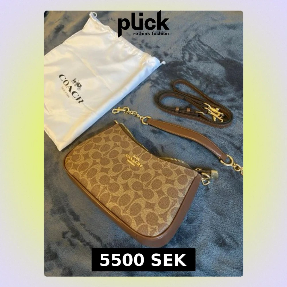 Snygg brun handväska från Coach med klassiskt logomönster och guldfärgade detaljer. Väskan har avtagbar axelrem och dragkedja upptill. Tillverkad i skinn och polyester, perfekt för dig som gillar stilrena accessoarer med lyxig känsla.