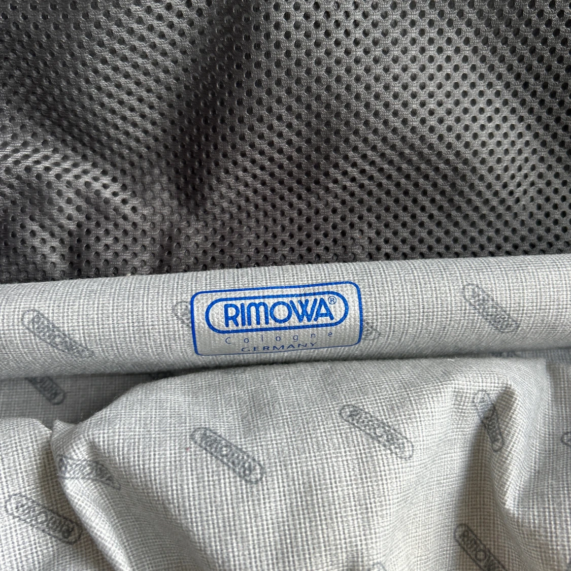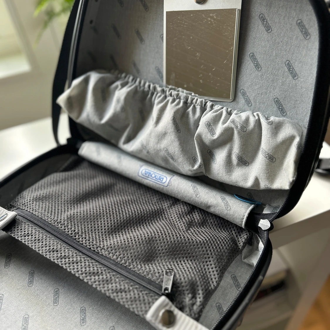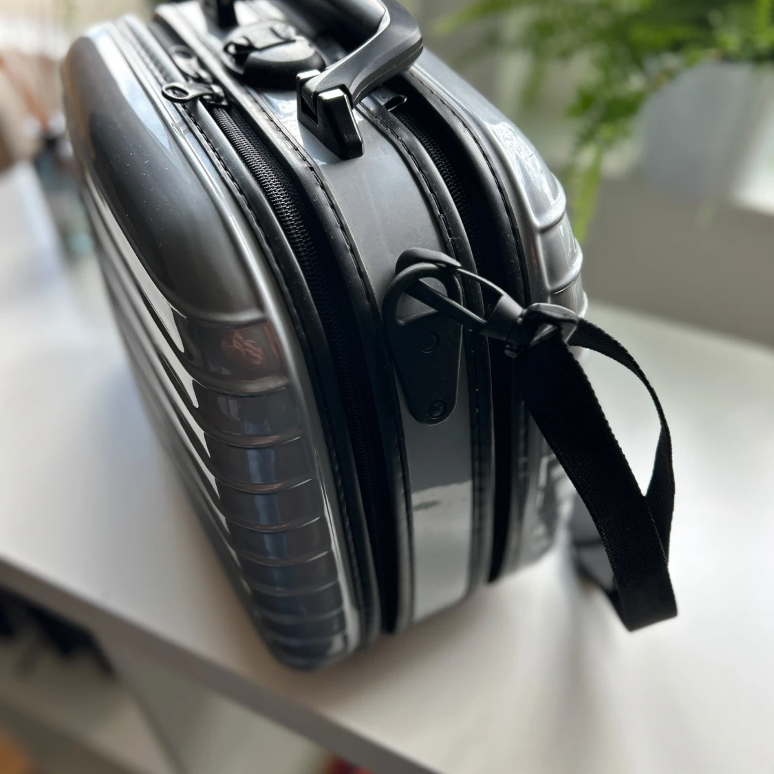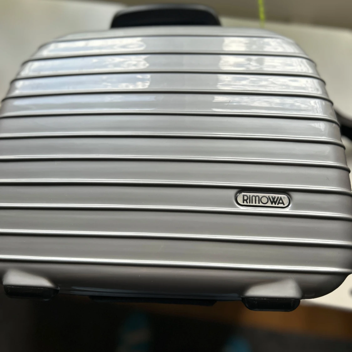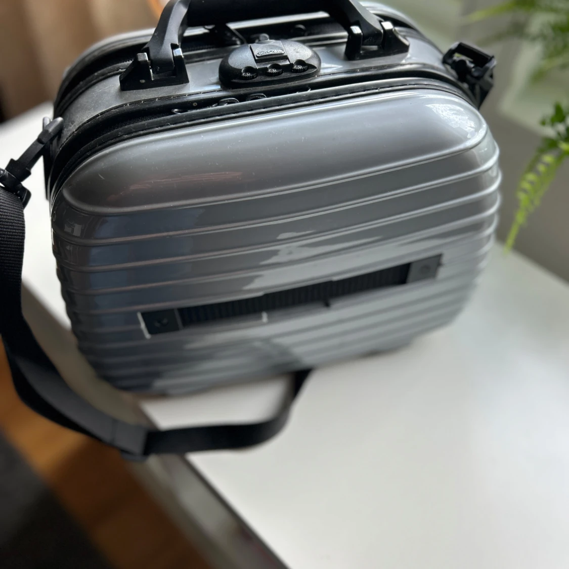 Snygg och stilren väska/neccesär från Rimowa i silverfärgad hårdplast med klassiska horisontella ränder. Väskan har både handtag och axelrem, dragkedja och smarta innerfack för organisering. Perfekt för dig som vill ha en clean och modern look.