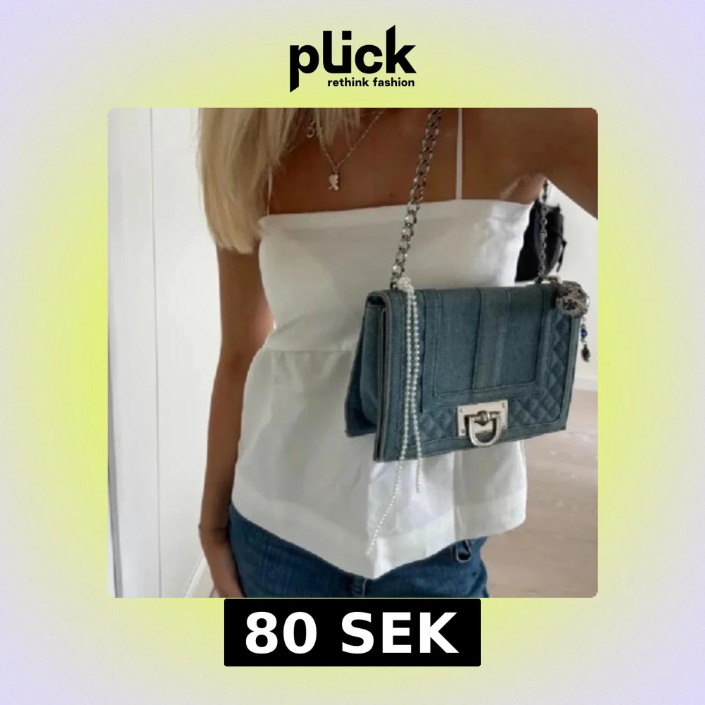 Snygg axelväska i blått jeanstyg med silverfärgad kedja och spänne framtill. Väskan har quiltade detaljer.❤️