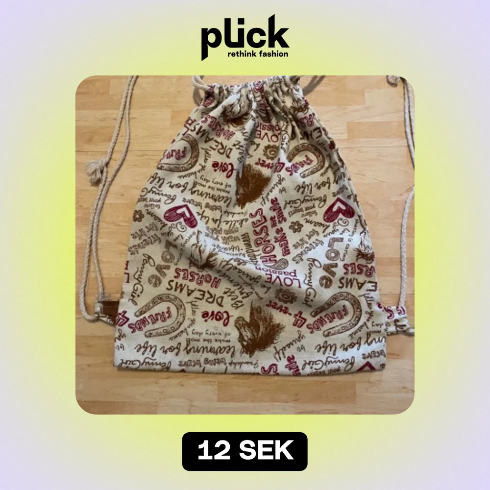 Gympaväska av grövre tyg med häst tryck. Den är 39cm hög och 30cm bred. Den har lite lös trådar som man kan se på sista bilden, men det är ej håll och påverkar inte väskan.