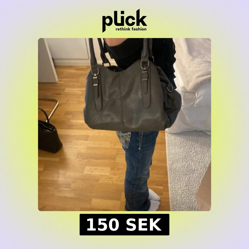 En mörkgrå praktisk väska att ha hängandes på axeln eller på armen. Några fickor och alla går att stänga till med antingen dragkedja eller en knapp. Ett band följer även med (bandet är i bra skick och samma färg som väskan. Har tidigare använts som en skol handväska och fungerar fortfarande toppen. Köpt på en marknad i Spanien.