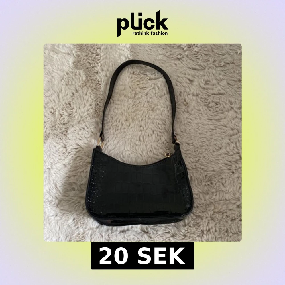 Säljer en svart axelväska med croco-mönstrad yta och glansig finish. Väskan har guldfärgade metalldetaljer och dragkedja upptill.
