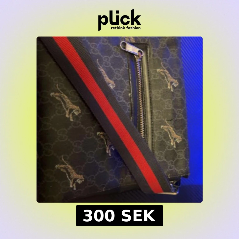 Snygg svart axelväska med leopardmönster och dragkedja. Väskan har en bred axelrem i rött och blått, vilket ger en cool kontrast. Perfekt för att bära dina dagliga nödvändigheter med stil.
