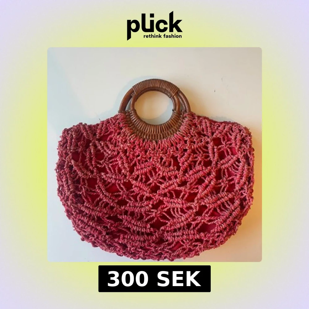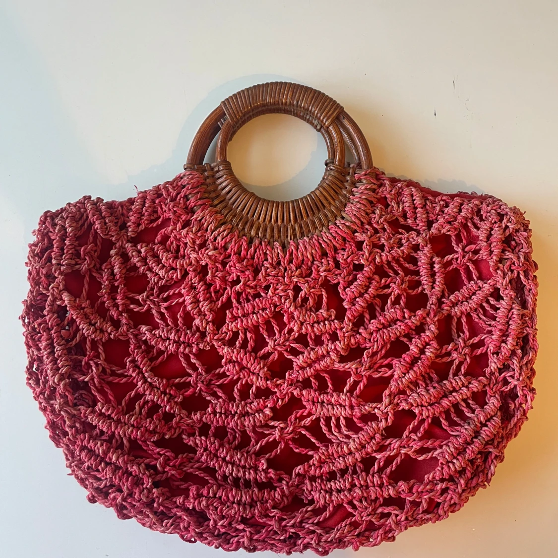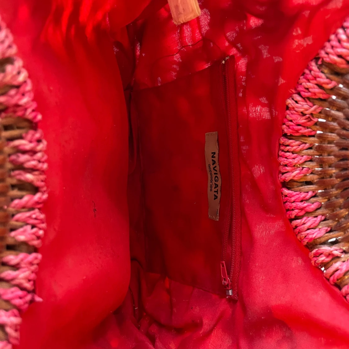 Säljer en unik röd handväska från Navigata med snyggt flätat yttertyg och runda handtag i trä. Väskan har ett innerfoder i rött tyg och en praktisk innerficka med dragkedja. Perfekt för dig som vill sticka ut med en bohemisk och färgstark accessoar.