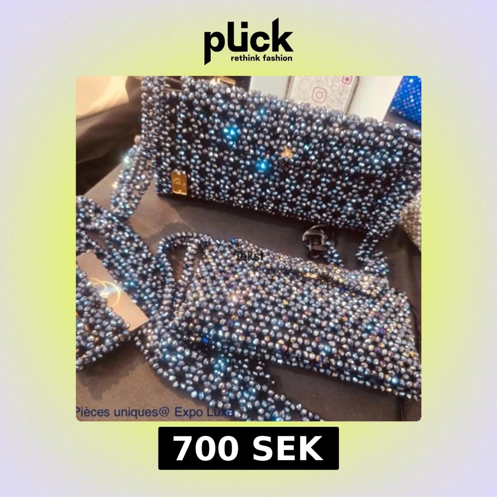 Säljer en unik kuvertväska, täckt med glittrande pärlor och stenar i silver och mörkblått. Väskan har en lång axelrem i matchande pärlor och en elegant, rektangulär form. Perfekt för dig som vill sticka ut med en riktigt blingig accessoar.