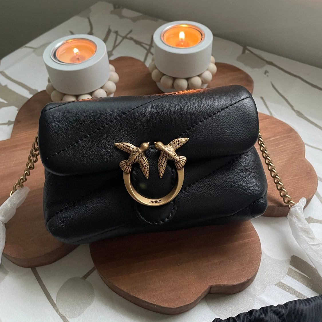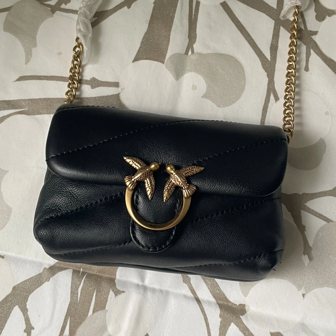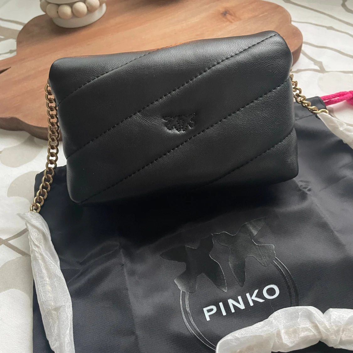 Brand new Pinko Love Puff micro shoulder bag, color black. Dimensions are shown in the pictures. The bag is pretty small, but super stylish. It fits the basics like your keys, earphones, and a small cardholder or wallet. • Product number: P6951H174-Q11 • Supplier model ID: 100041A0F2-Z99Q • Detachable shoulder strap • Outer material: leather • Handle length: 50 cm. More pics: https://www.vinted.fi/items/7145710247-pinko-love-puff-mini-micro-shoulder-bag