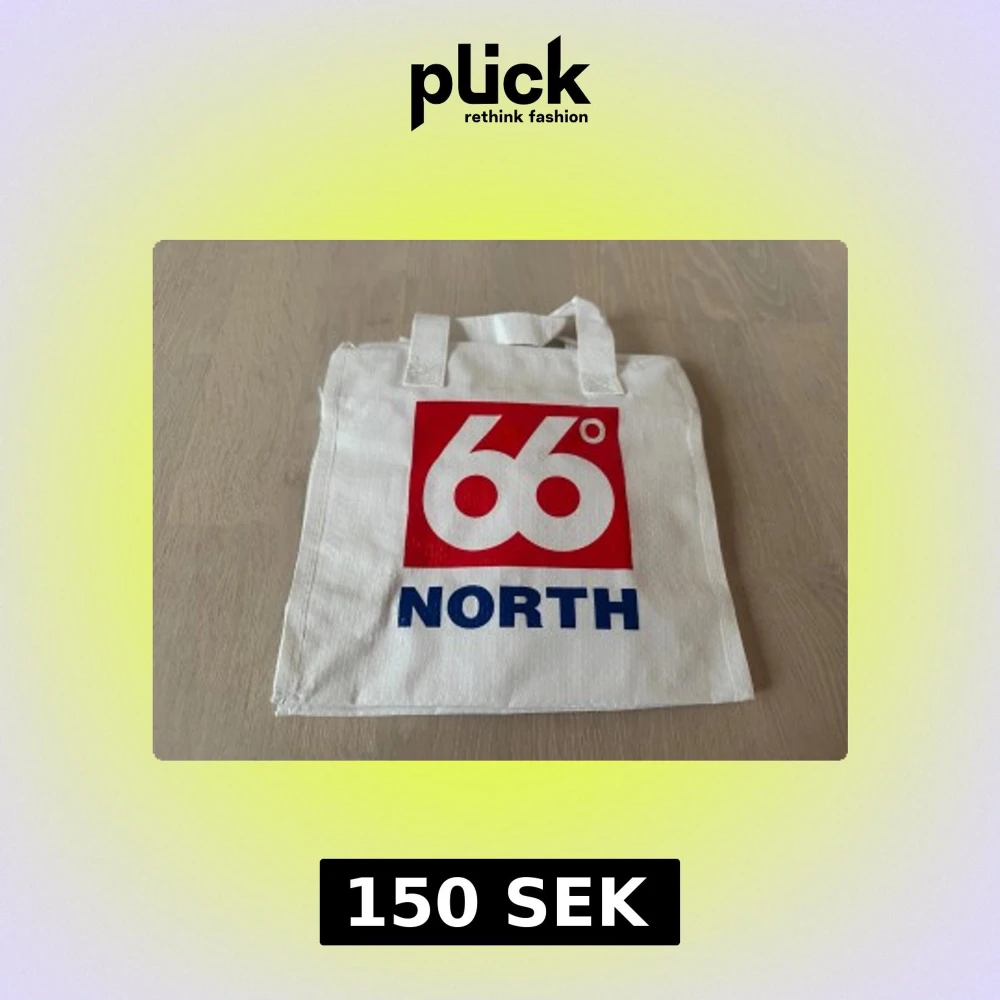 Vit shoppingväska från 66 North med stort rött och blått logotryck på framsidan. Väskan har två korta handtag och är tillverkad i slitstark syntet. Perfekt för att bära med sig grejer till skolan eller stan.