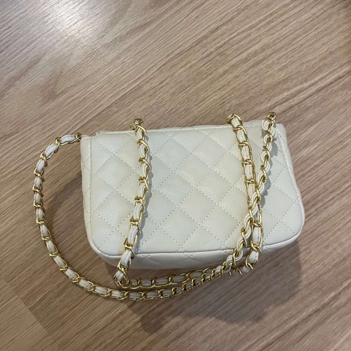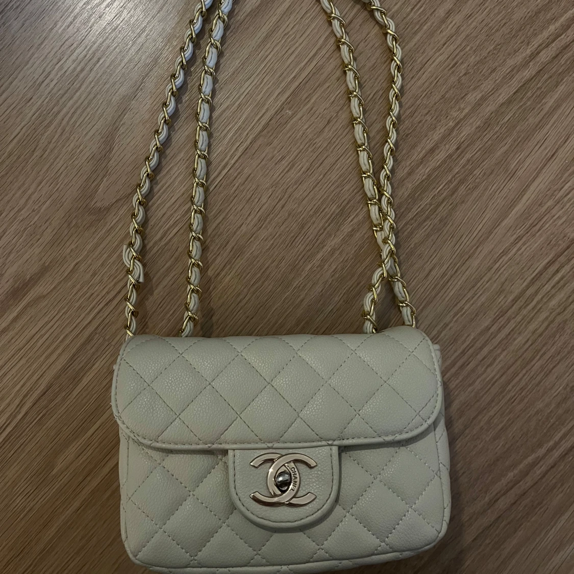 Säljer en stilren vit axelväska med klassiskt quiltat mönster och CC-logga i metall framtill. Väskan har en snygg kedjerem med gulddetaljer och är tillverkad i skinn. Perfekt storlek för det viktigaste och ger en lyxig känsla. Pris går att diskutera.