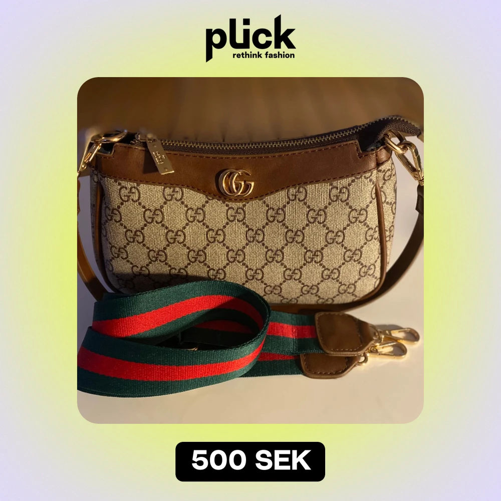 Snygg axelväska i beige och brunt. Väskan har en justerbar axelrem i grönt och rött, samt detaljer i guld.