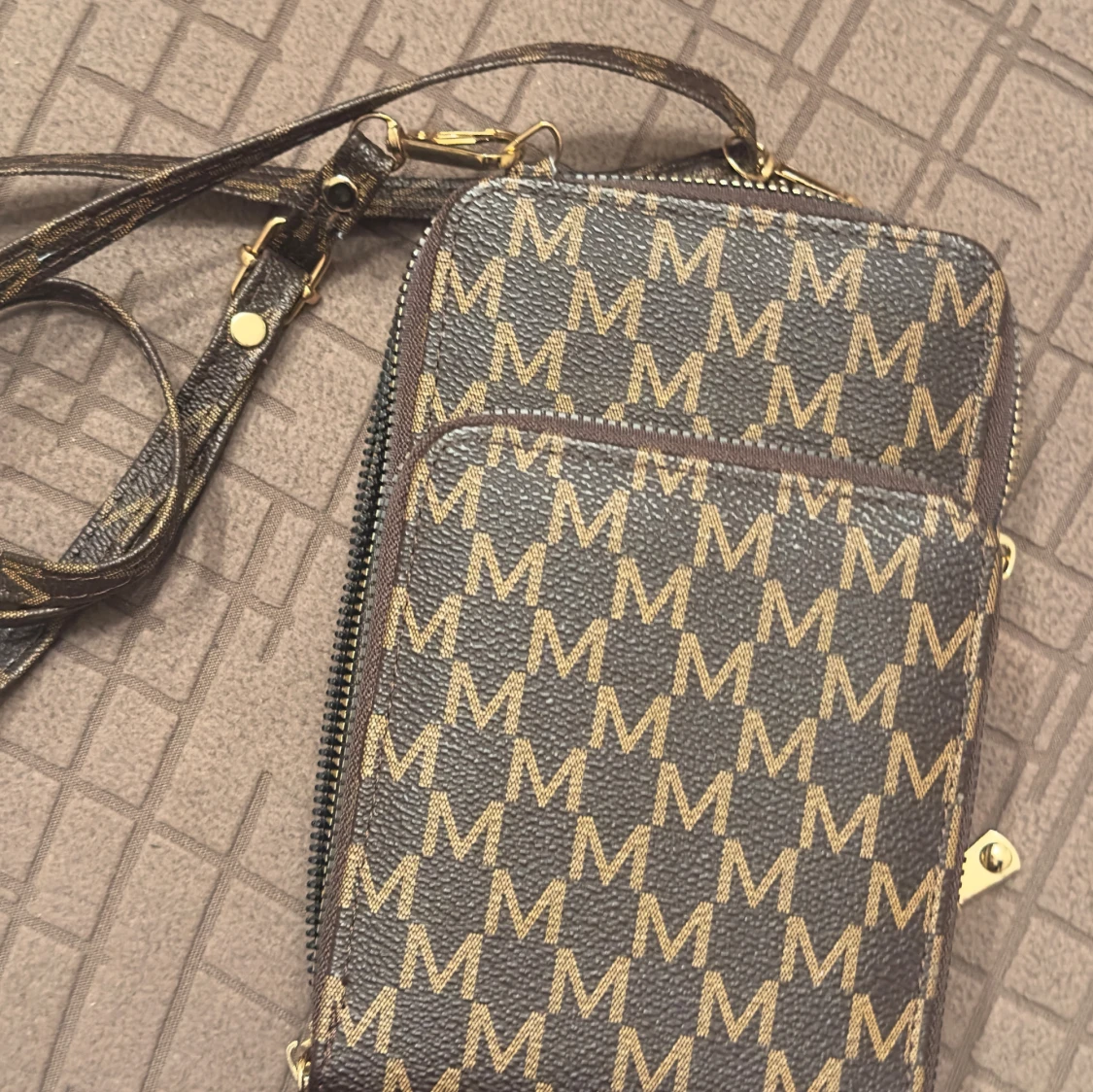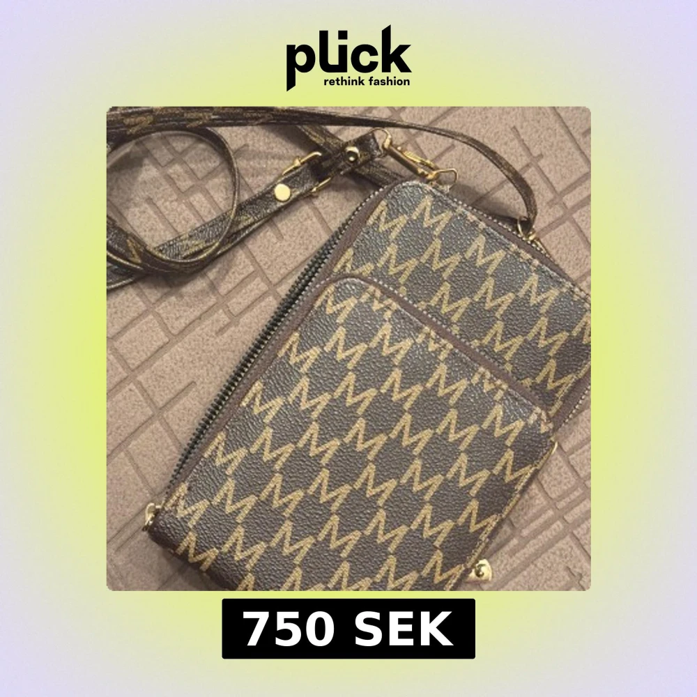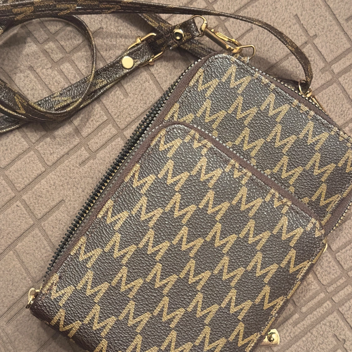 Snygg brun axelväska från Michael Kors med justerbar rem och dragkedja. Väskan har ett tydligt M-mönster i guld över hela ytan och är tillverkad i tåligt skinnliknande material. Perfekt storlek för mobil och småprylar.