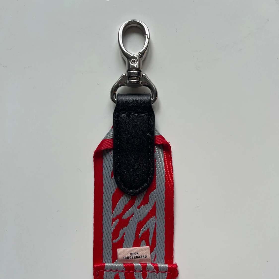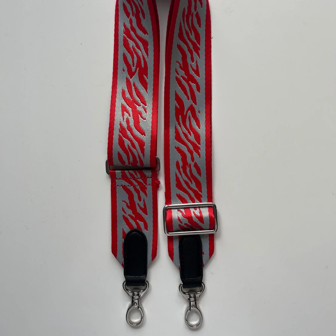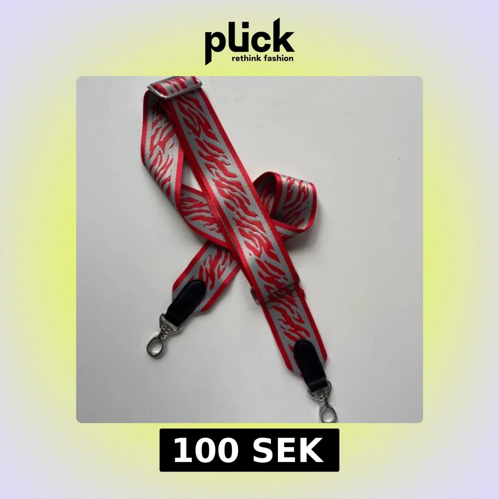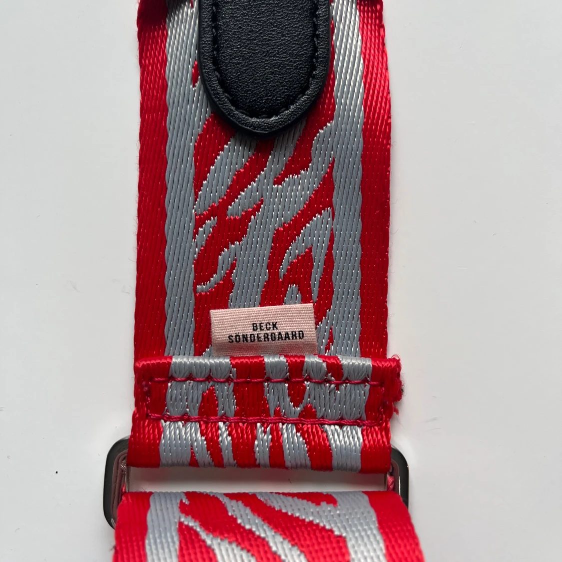 Justerbart axelband till väska från Beck Söndergaard. Röd och grå zebra/tiger-mönster, tror att modellen heter zestroke bag strap. Använt fåtal gånger, i jättefint skick. Längd justerbar i intervallet 76-122 cm.