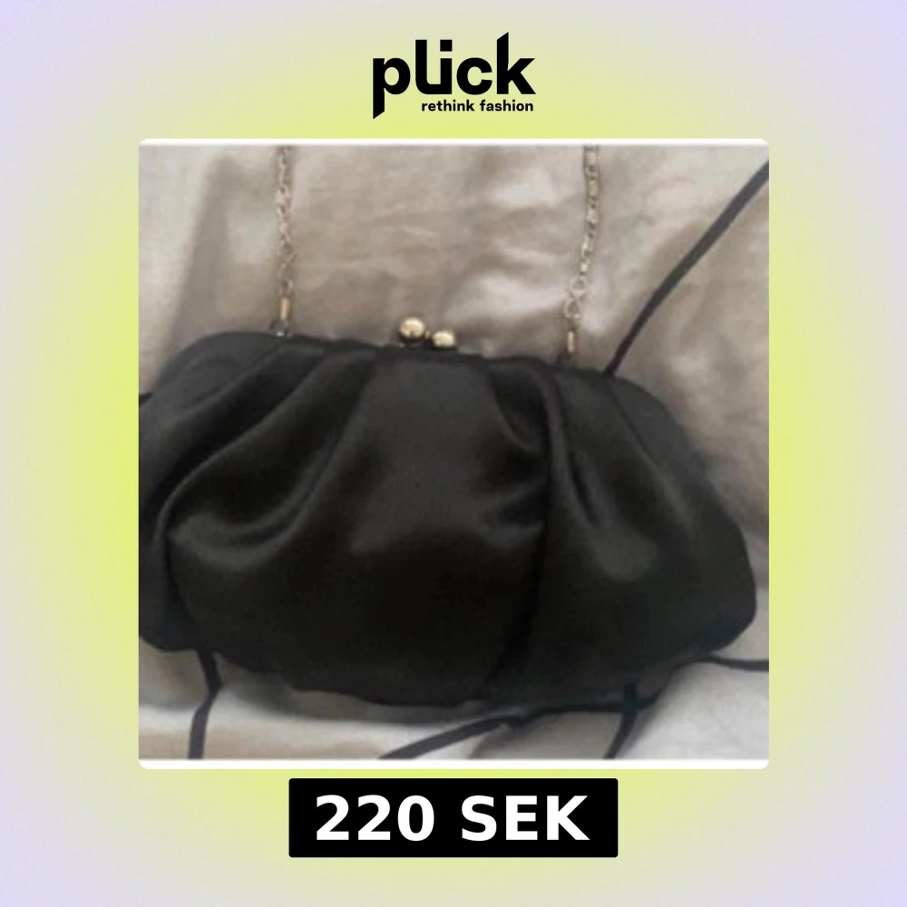 Snygg svart kuvertväska i satinliknande material med mjuka veck och guldfärgad kedja. Väskan har en klassisk metallknäppning upptill och passar perfekt när du vill lyfta din outfit med en elegant accessoar.