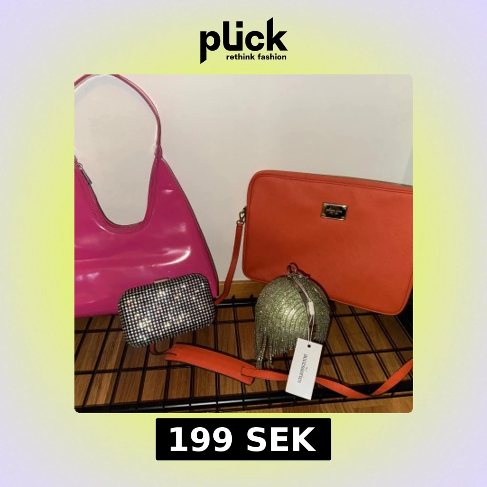 Fyra snygga väskor: en rosa axelväska i glansigt syntet, en orange datorväska från Michael Kors i strukturmaterial, en glittrig silver clutch med pärlor och en rund grön glittrig kuvertväska med fransar från NLY Accessories. Perfekta för att sticka ut med färg och glitter.