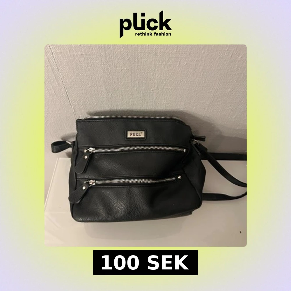 Svart axelväska i syntetmaterial från FEEL med flera fack och silverfärgade dragkedjor. Väskan har justerbar axelrem och snyggt mönstrat innerfoder.