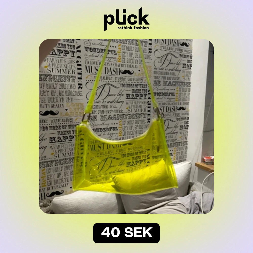 Genomskinligt handväska i neon grön från Shein . Den har tyvärr inga fickor och dragkedjan är lite jobbig.