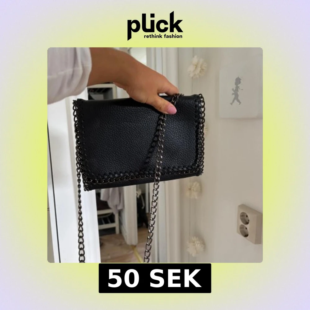 Snygg svart axelväska i skinnimitation med grov kedjerem och dekorativ kedjedetalj runt kanterna. Stilren och edgy design som passar perfekt till streetwear eller en cool vardagslook.