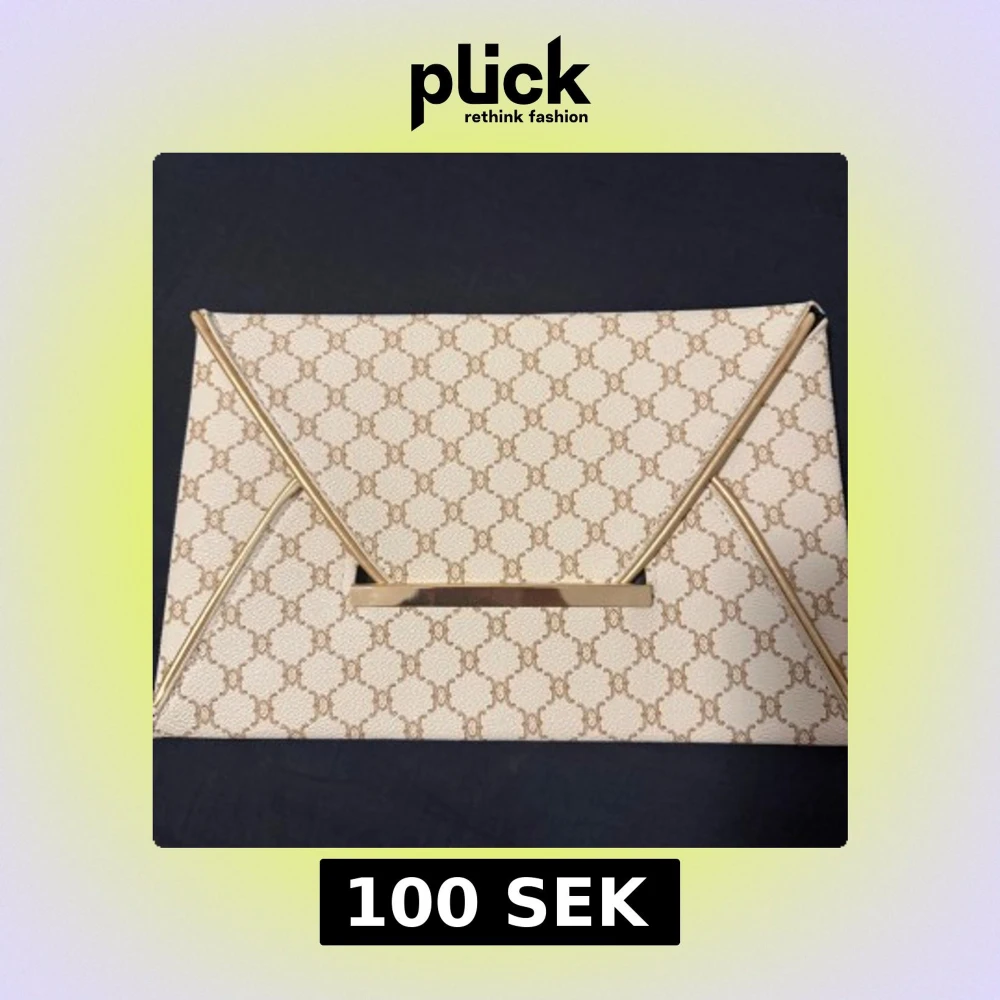 Snygg beige kuvertväska med klassiskt brunt mönster och guldfärgade detaljer. Väskan har en stilren, rektangulär form och magnetstängning. Utsidan är i syntetmaterial och insidan är svart. Perfekt för att lyfta din outfit.