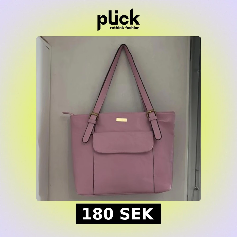 Stor rosa axelväska med två långa axelband och guldfärgade spännen. Väskan har en framficka med lock, dragkedja upptill och en extra ficka med dragkedja på baksidan. Tillverkad i skinnimitation med svarta kanter för kontrast. Har en liten skada på sidan.