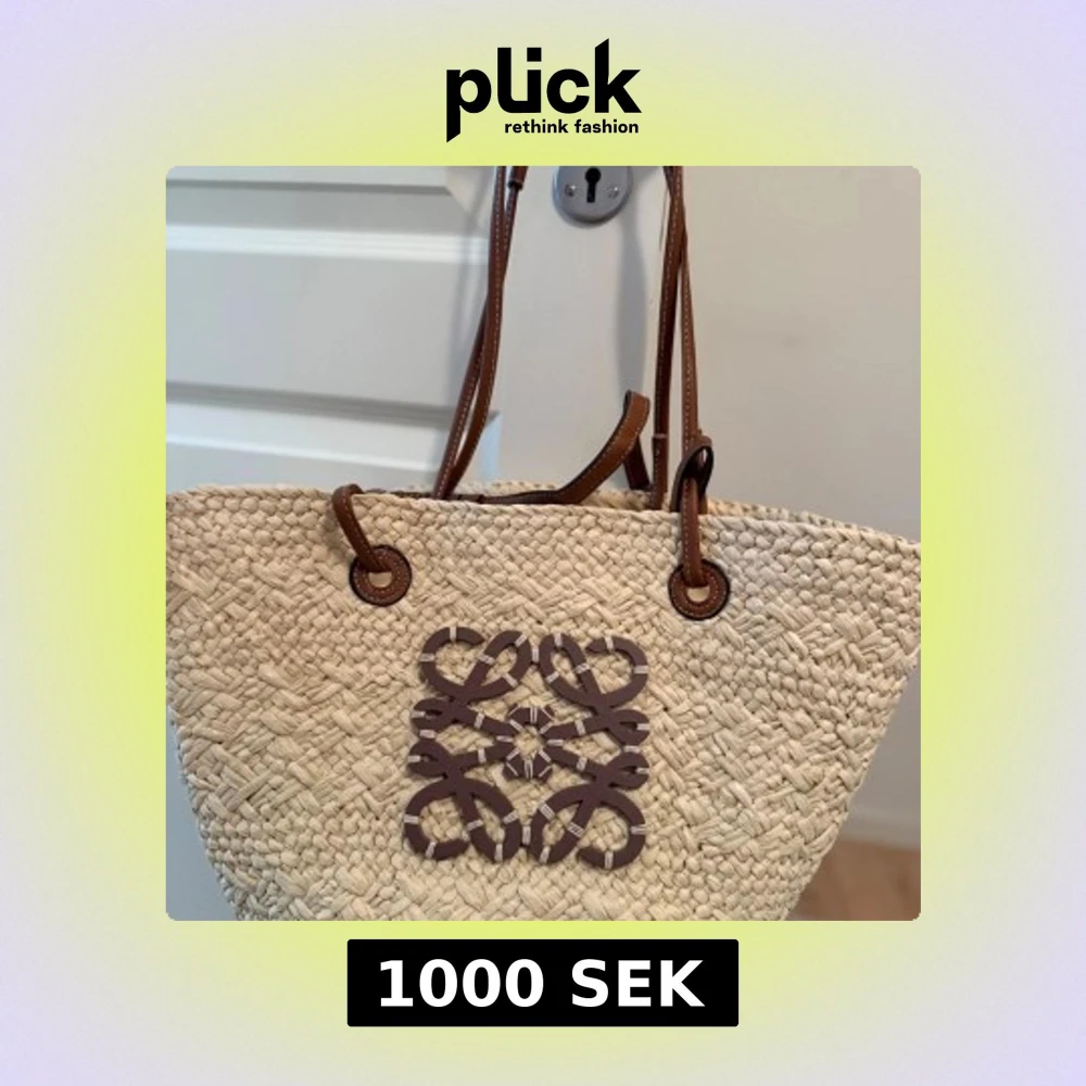 Säljer en beige shoppingväska från Loewe med bruna läderhandtag och ett stort brunt Loewe-emblem framtill. Väskan är flätad i naturmaterial och har en rymlig form, perfekt för att bära med sig allt man behöver. Snygg och trendig detalj till din outfit.