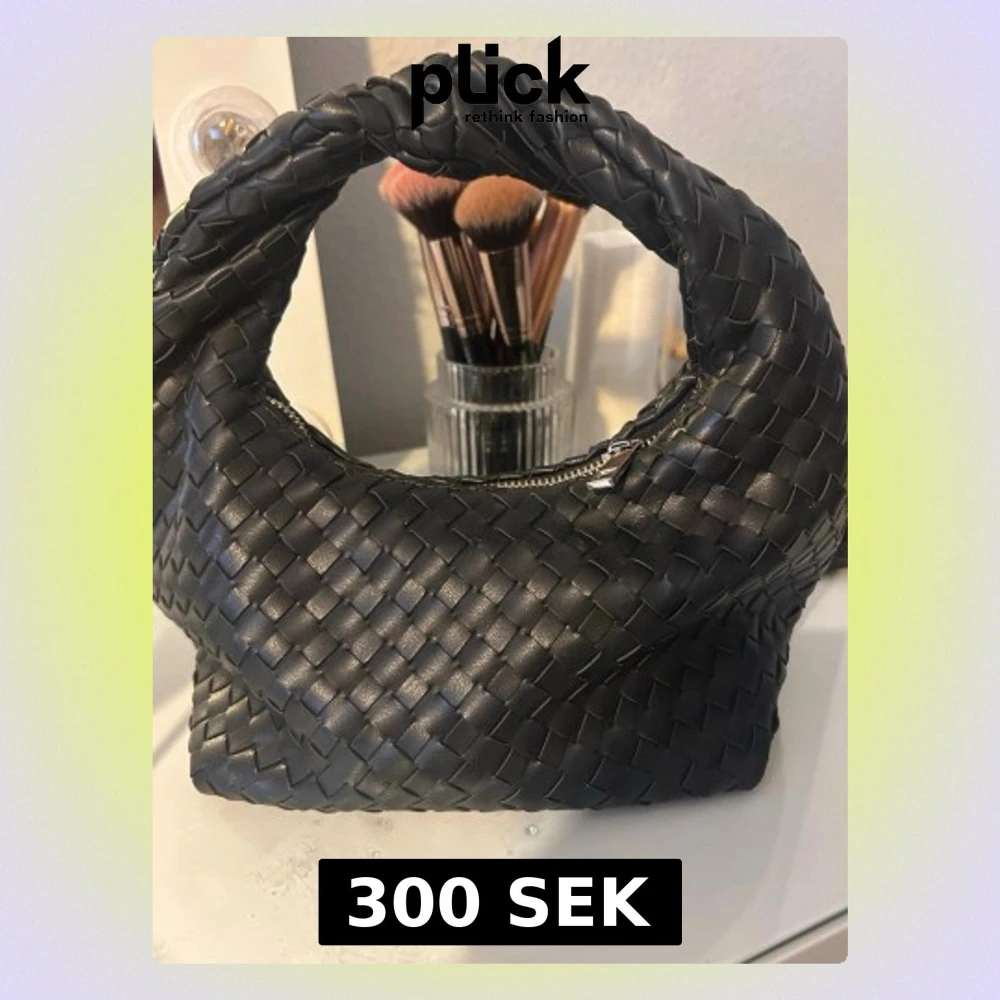 Säljer en svart handväska med snygg flätad design och rundat handtag. Väskan är tillverkad i skinn och har en praktisk dragkedja upptill. Perfekt storlek för att få plats med det viktigaste och ger en cool vibe till din outfit.
