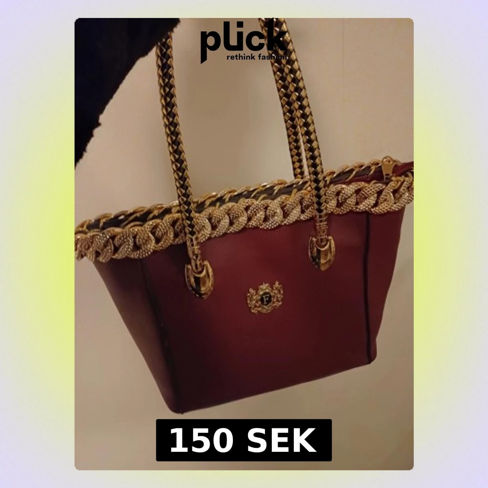 Säljer en vinröd handväska med lyxiga guldfärgade kedjehandtag och dekorativt emblem framtill.