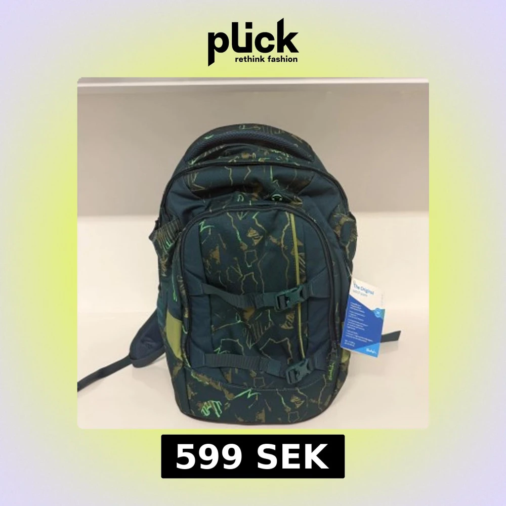 Cool ryggsäck från Satch i mörkgrönt med abstrakt mönster i grönt och gult. Ryggsäcken har flera fack, justerbara axelremmar och vadderad rygg för extra komfort. Perfekt för skolan eller äventyr, med smarta spännen och sidofickor för småprylar.