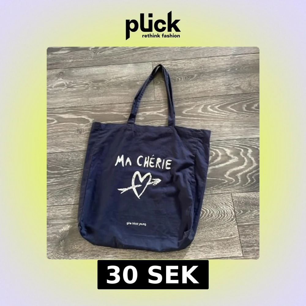 Stor och rymlig mörkblå shoppingväska från Gina Tricot Young med trycket 'MA CHÉRIE' och ett hjärta med pil på framsidan. Väskan har två långa handtag och är tillverkad i bomull. Perfekt för att bära med sig allt man behöver under dagen.