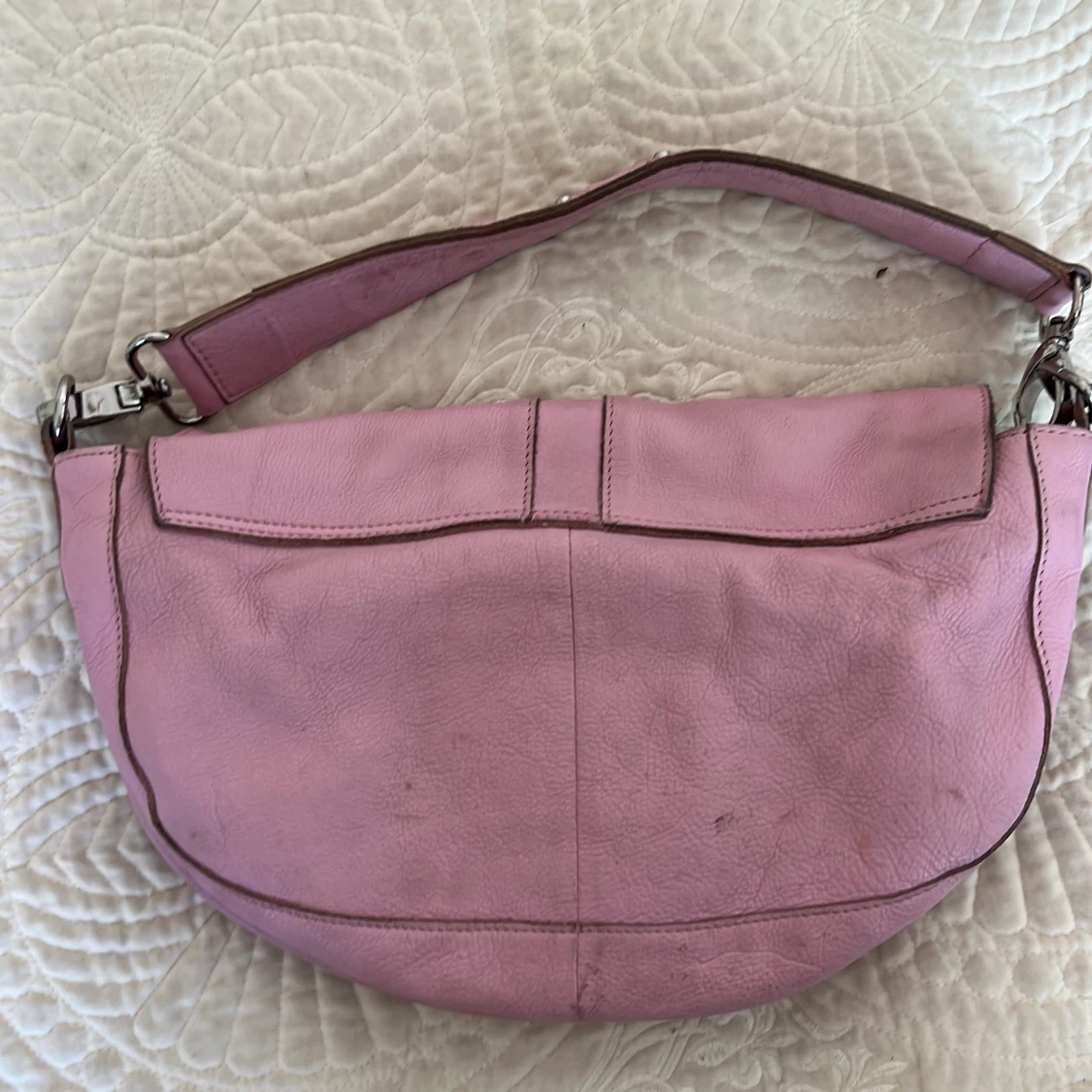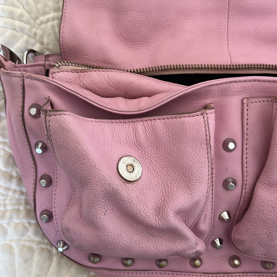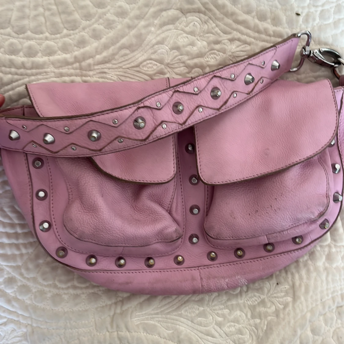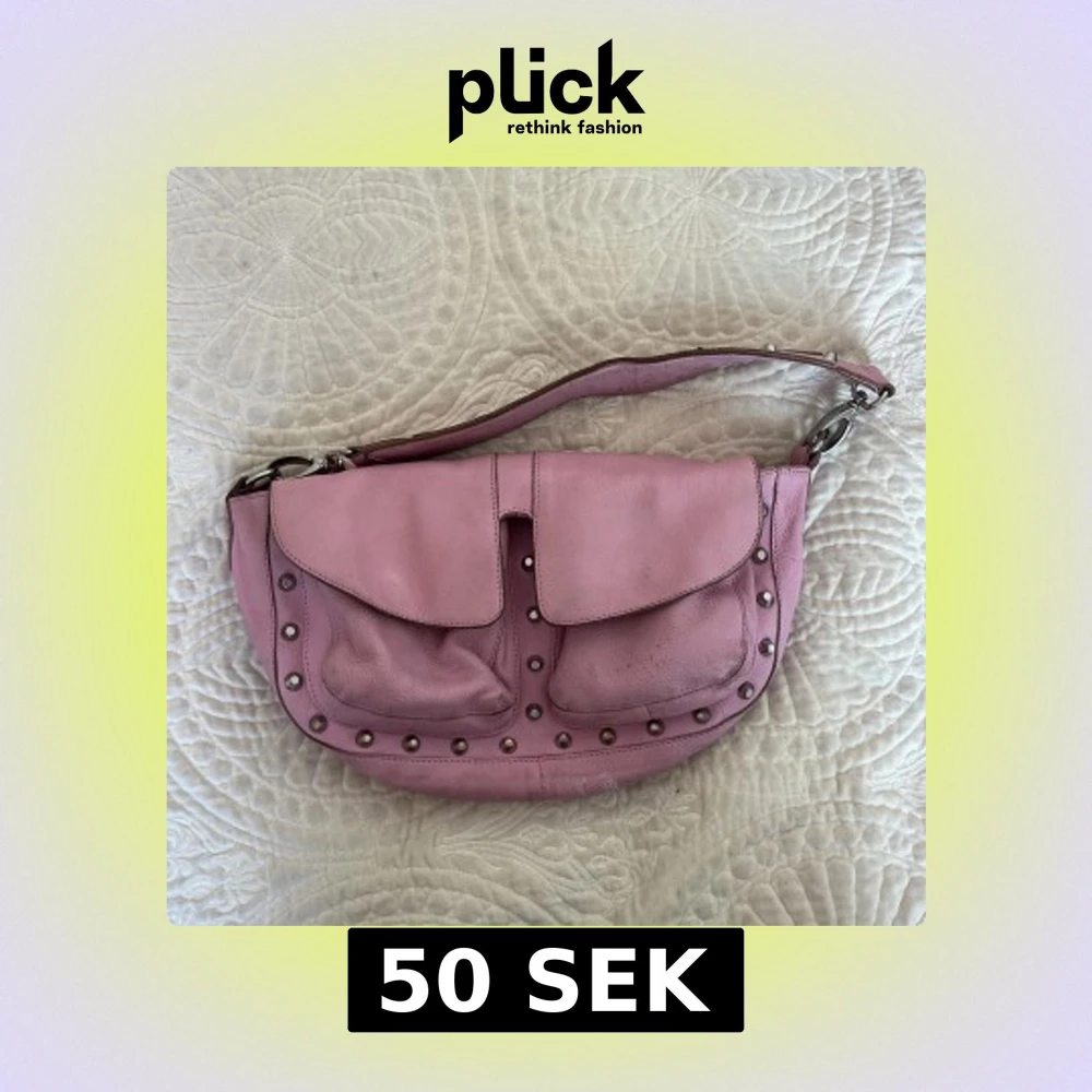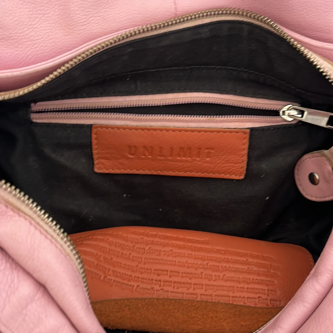 Säljer en rosa axelväska från Unlimited i skinn med två stora fickor framtill och dekorativa silverfärgade nitar längs kanterna och axelremmen. Väskan har dragkedja upptill och ett innerfack med dragkedja. Perfekt för dig som vill sticka ut med en cool accessoar.