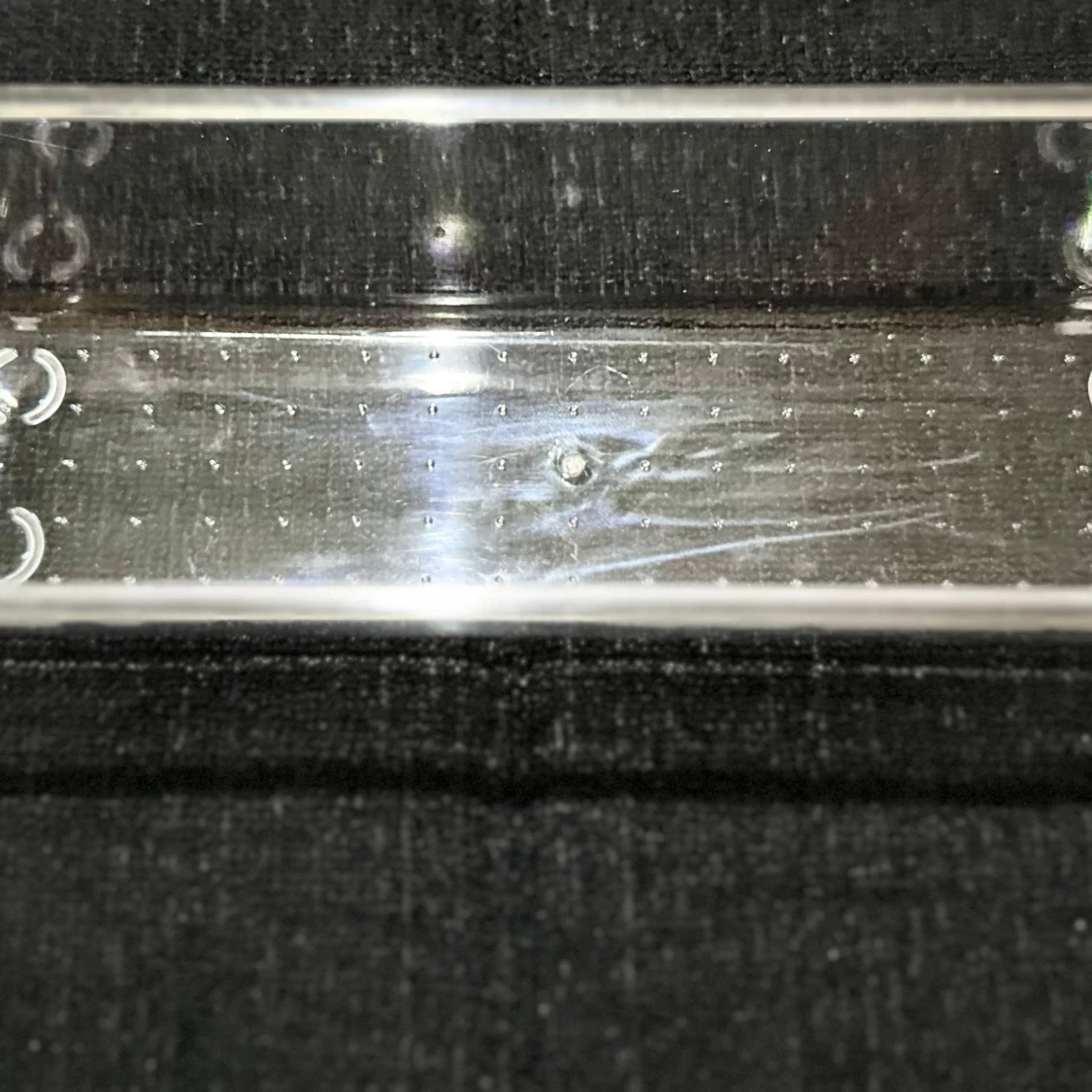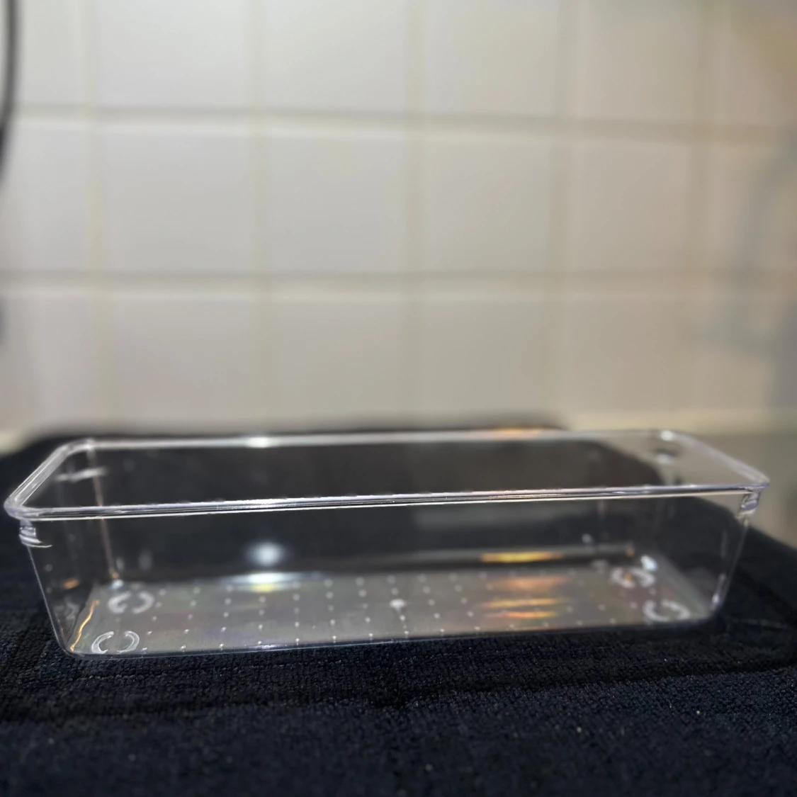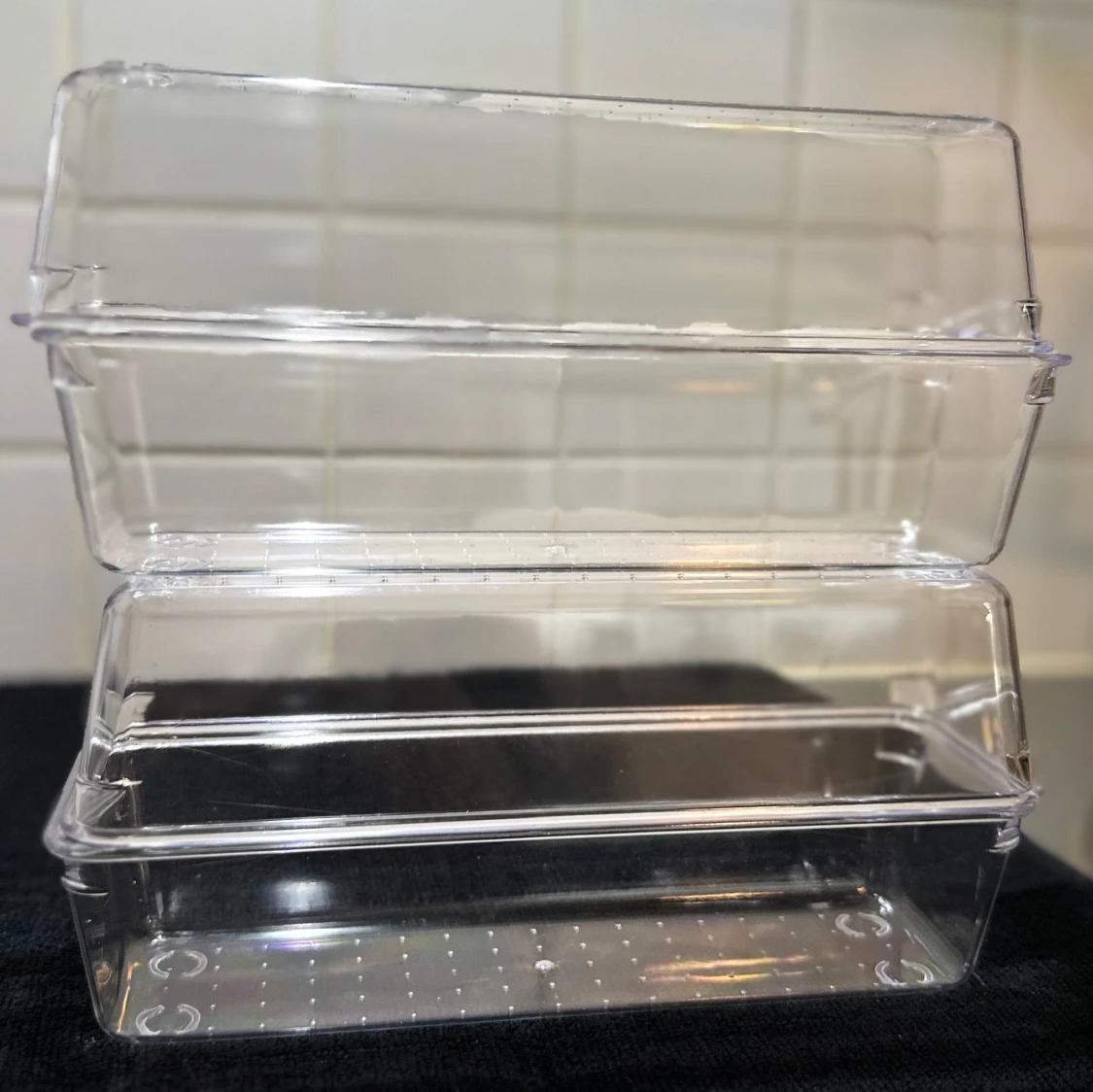 Säljer en rektangulär transparent plastlåda med låg kant. Perfekt för förvaring av småsaker eller mat. Lådan är helt genomskinlig och har en slät yta med små upphöjda prickar i botten. 40kr för alla 4 och 10kr st.