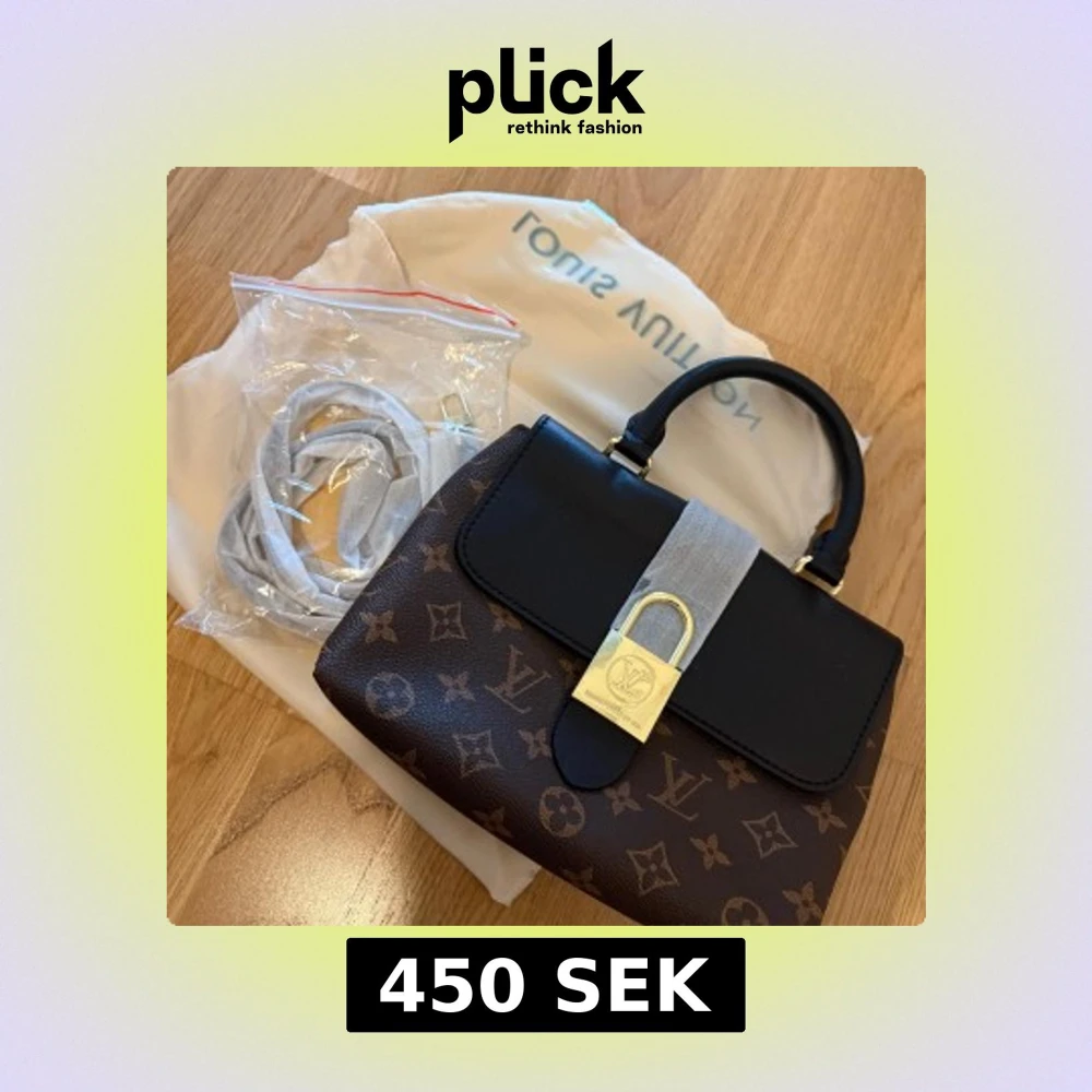 Säljer en exklusiv handväska med klassiskt brunt monogrammönster och svart lock. Väskan har guldfärgat lås, svart handtag och medföljer axelrem. Perfekt accessoar för dig som vill ha något lyxigt och tidlöst.