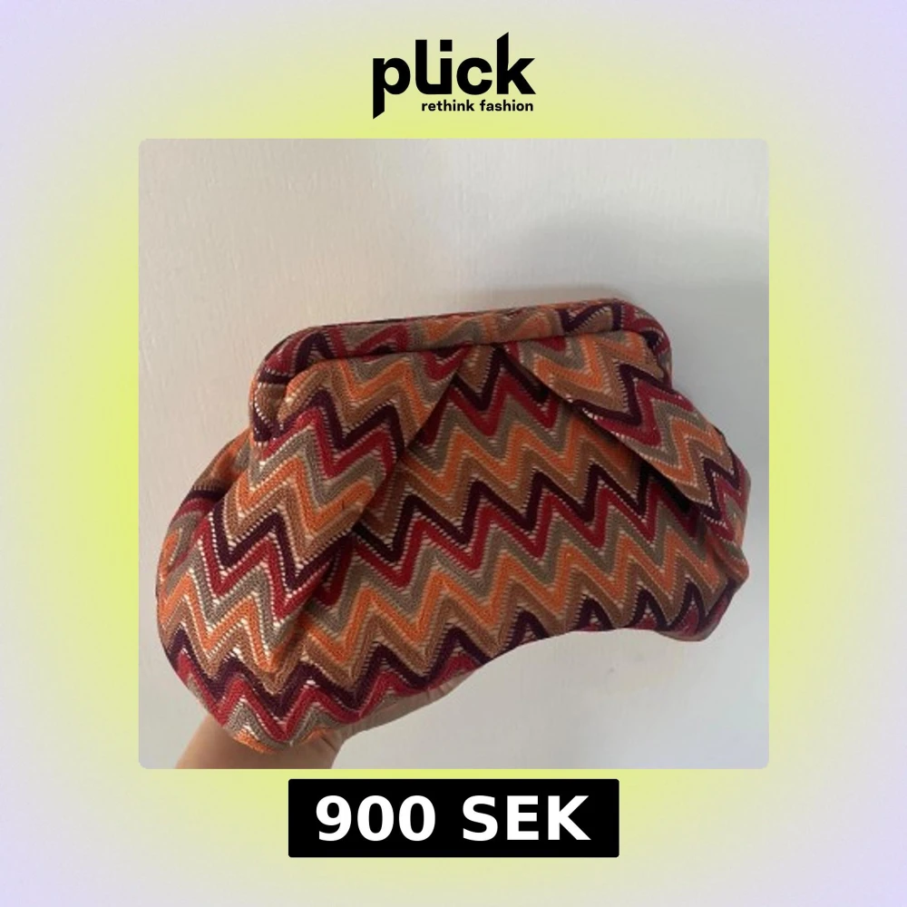 Unik clutch från Beck Söndergaard med färgglatt zickzackmönster i orange, rött, beige och vinrött. Väskan är i tyg med innerfoder och har en praktisk innerficka med dragkedja. Inget tecken på användning!