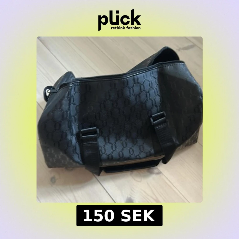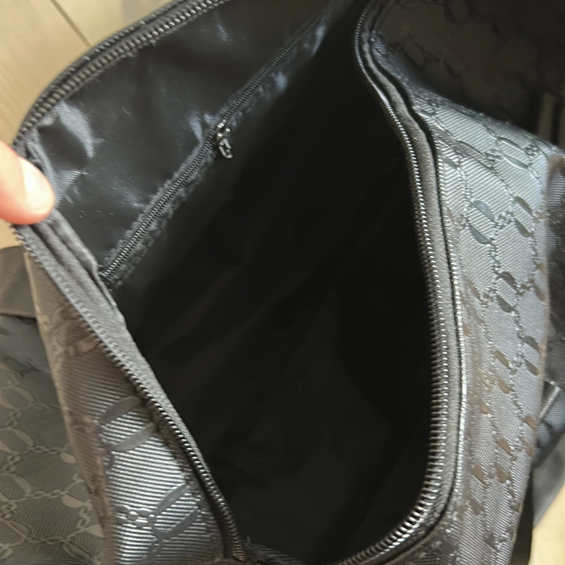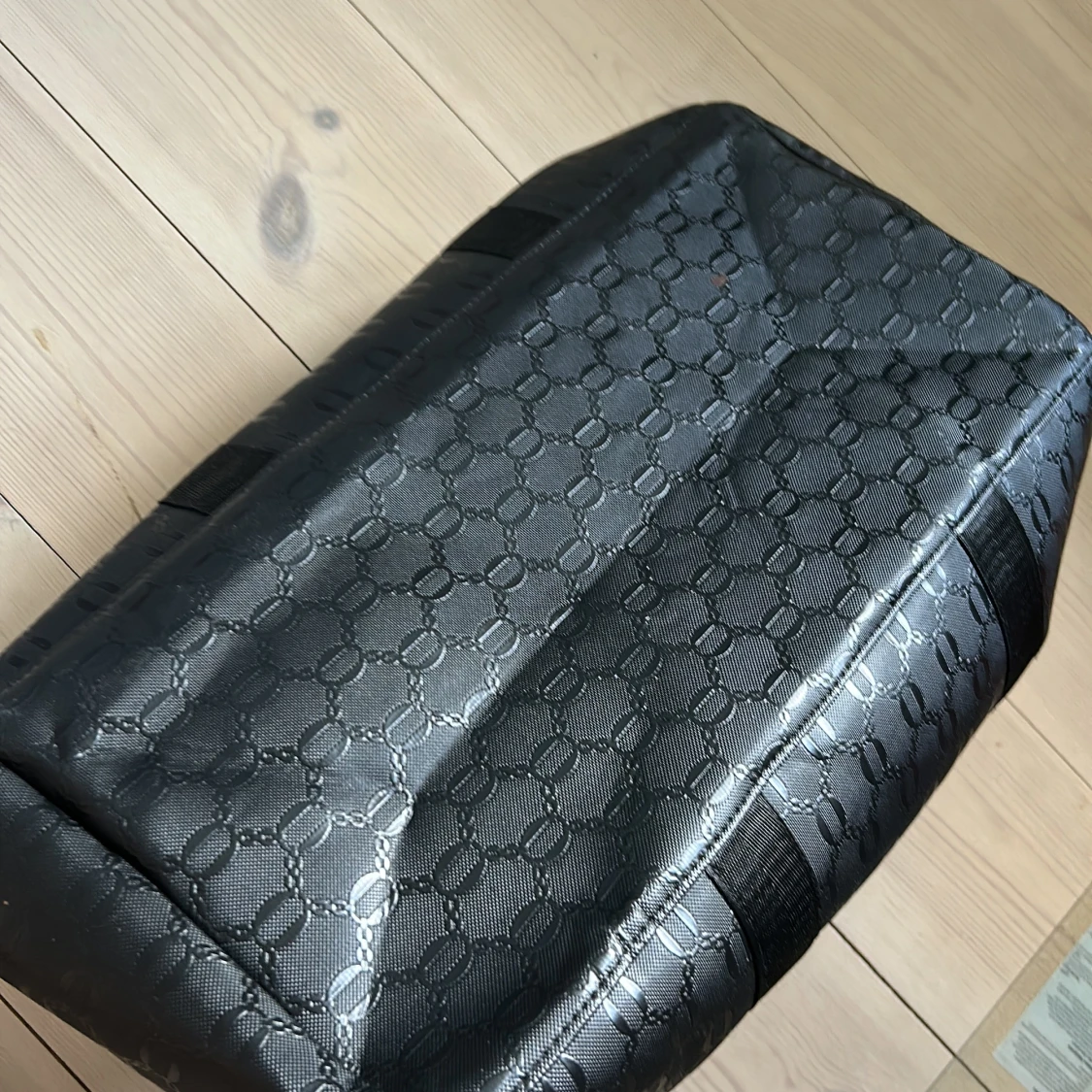 Stor svart weekendbag med diskret mönster i material som känns som syntet. Väskan har två kraftiga handtag, dragkedja upptill och ett rymligt huvudfack med innerficka. Perfekt för resor eller gymmet när du vill ha plats för allt.
